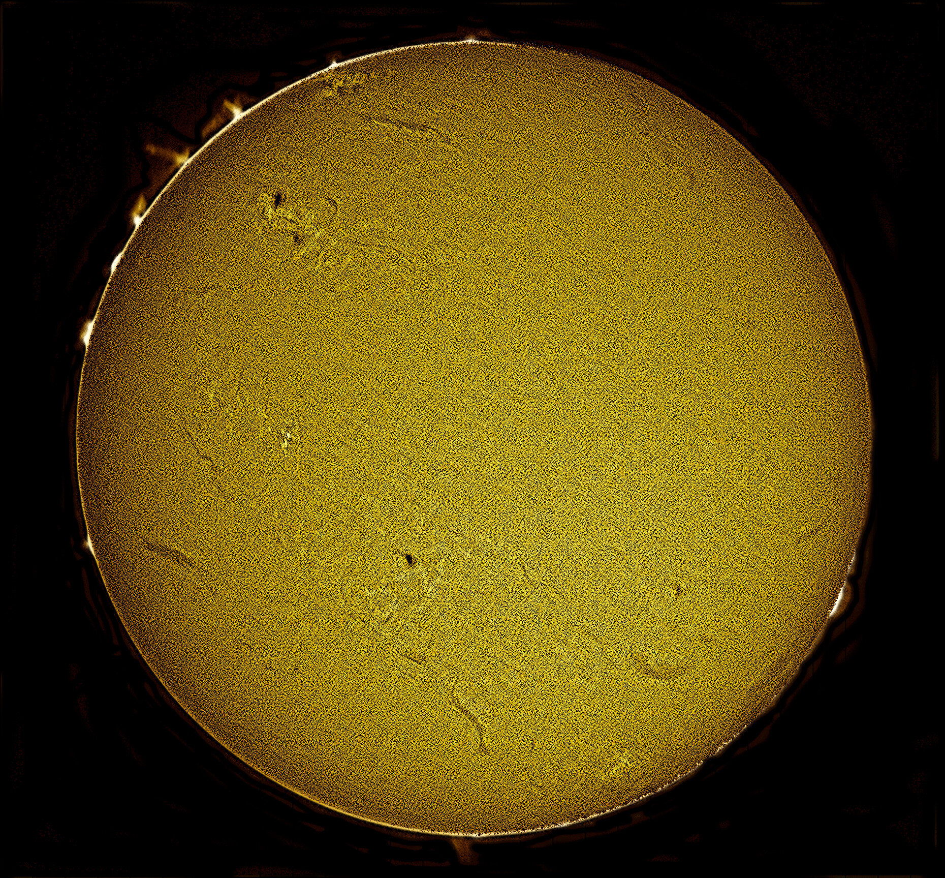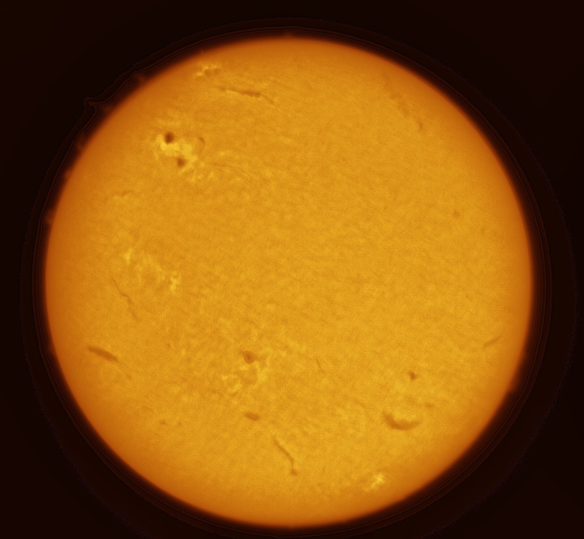 Bonjour, un petit Soleil avec l'Acuter 40/100 Ha. Film de 1000 images, 200 retenues. 1- Autostakkert4 + IMPGG + GIMP3 2- Pix, process SolarToolBox. Les protus apparaissent même faiblement. 3- Autostakkert4 + Registax6 + GIMP3. Fusion avec une image des protus. J'ai tiré un peu fort sur les curseurs !-