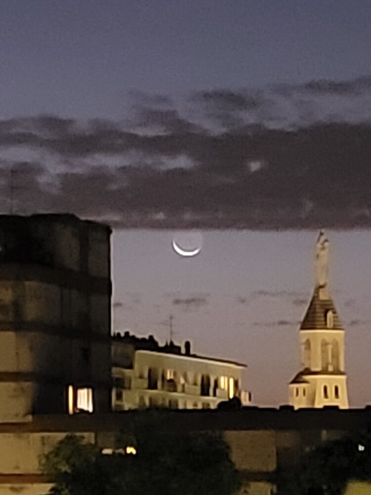Bonjour Photo prise par ma fille avec un smartphone, depuis un balcon du centre de la ville de Pau. Ce soir là, en traçant par la pensée une ligne reliant les deux pointes du fin croissant de lune, je trouve cette ligne imaginaire quasiment parallèle à l'horizon, c'est à dire horizontale. Cette configuration s'observe plutôt aux latitudes plus proches de l'équateur. Auriez-vous un début d'explication pour cette configuration sous notre latitude ? Astrojp