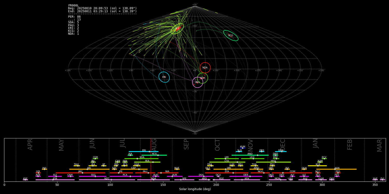 Une image de la nuitdu 10/08 montrant les météores enregistrés par mes caméras de mon système GMN . le pic est prévu pour demain le nombre le plus élevé de météores est attendu le 12 août, à 13:15 GMT . Les caméras font un calcul de trajectoire pour contrôler l'origine de chaque "Etoile filante" ... la convergence des trajectoire nous indique la constellation de Persée comme origine visuelle...les météores s'appellent alors des Perseides . Cette année la lune n'aide pas...mais je fait aussi une captation radio que je vous ferais voir prochainement. Mes caméras tournent toute l'année toutes les nuits, pour voir et étudier toutes les pluies annuelles. J'essai depuis plusieurs années de faire des corrélations multi spectrale ( radio VHF, radio VLF ou ELF, video, et son ) , les météores ça a été le début de ma passion pour l'astro et ça continue depuis 20 ans ! Tout le matériel est installé aux Esperelles avec aussi un SQM Ninox pour faire des mesures demandées par le parc national des Cévennes pour le label RICE. On est Bortle 2. Hervé