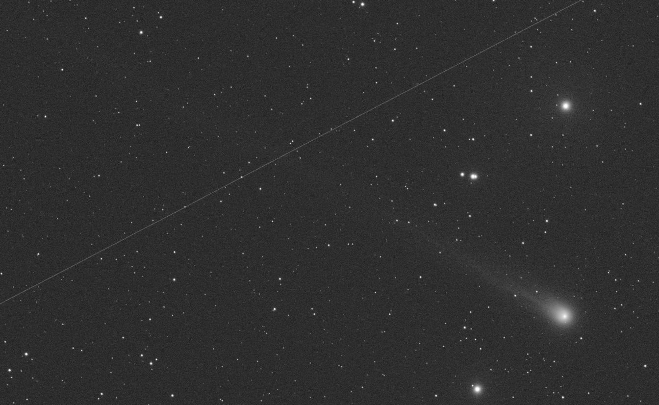 Bonjour Elle part en morceaux après son passage à proximité du Soleil... Et l'eVscope l'a capturée ce matin vers 5h30 depuis la Savoie. ( https://blogs.futura-sciences.com/feldmann/2025/11/16/la-comete-c-2025-k1-atlas-est-en-train-de-se-briser/ ) Plusieurs structures dans le noyau sont visibles sur cette capture de 40s. 😉