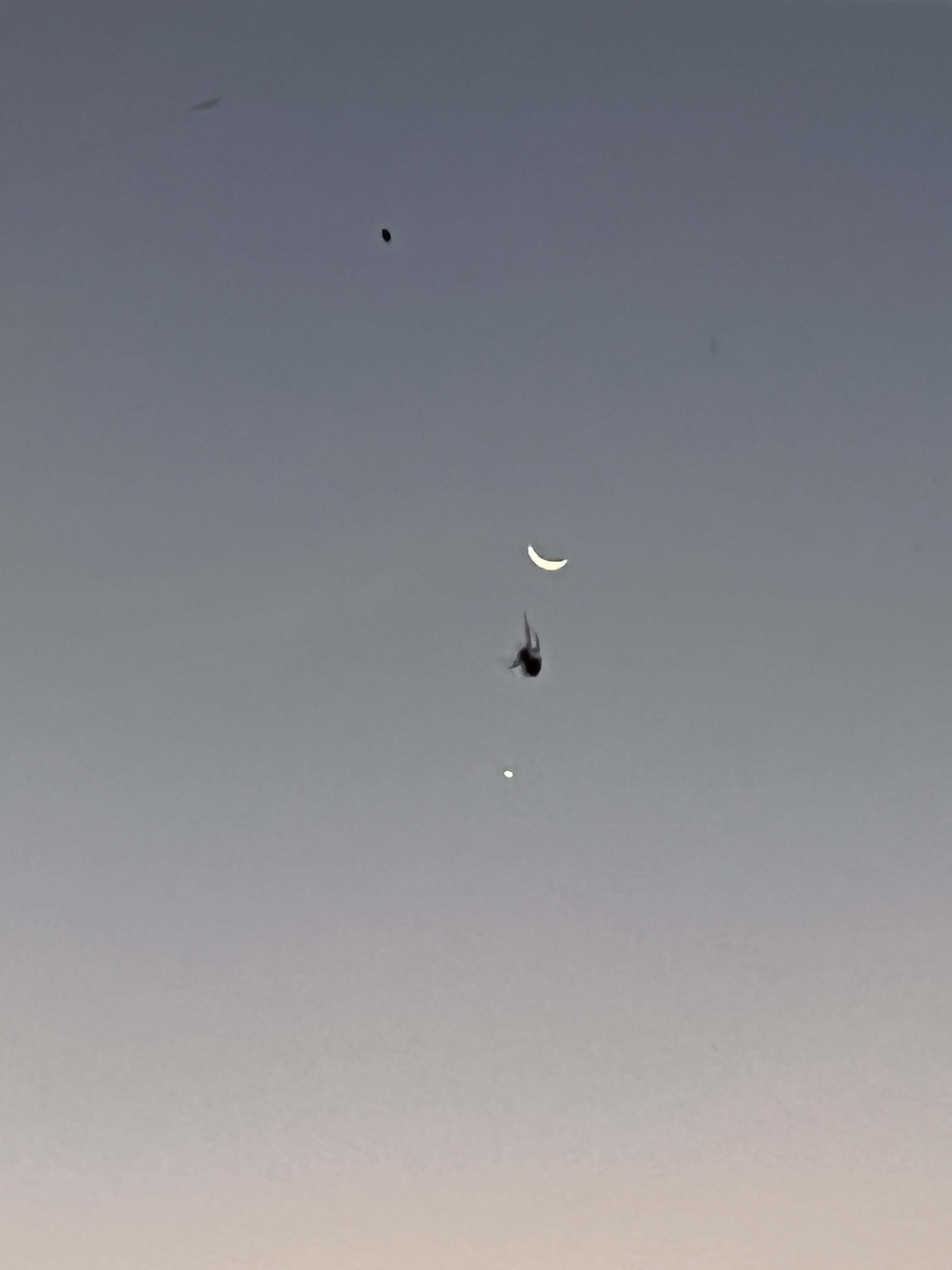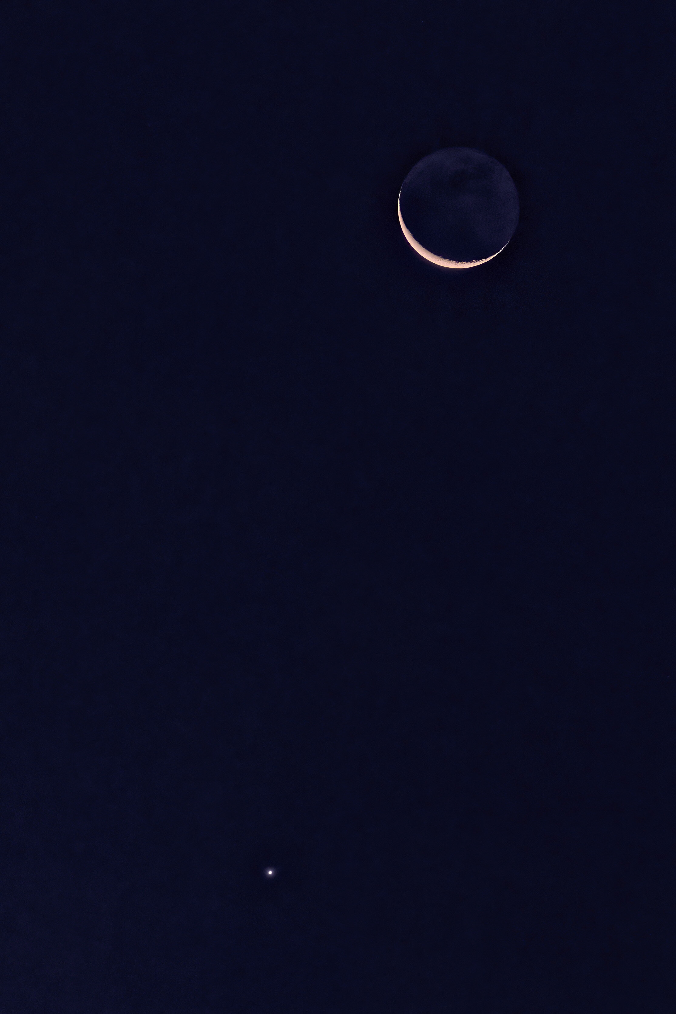 Bonjour, Rapidement, en passant, voici un image sans prétention prise Vendredi matin vers 7:00 alors que j'allais faire mes flats vite fait avant de partir au job. Je lève la tête et la spectacle Lune-Venus, à L'est, vraiment superbe... Du coup, je termine les flats et hop, la SQA55 avec le Z6 va pointer vers l'endroit. Je passe en live view après avoir tout déconnecté dans NINA, réglage ISO, cadrage, et hop, 3-4 photos avant de tout parquer. Après quelques traitements Siril (flats + stack) / pix (arcsinstretch + gradient) /PS , voici l'image et un crop pour la forme.
