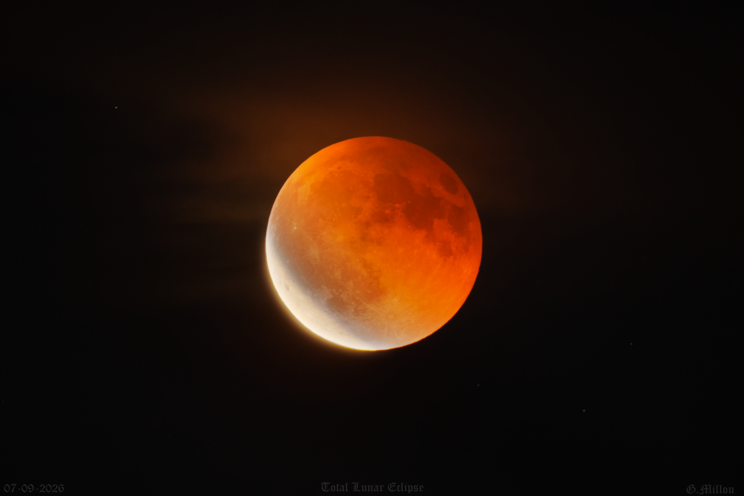 bonjour a tous ! Voila ma petite contribution à l'éclipse lunaire du 07/09/26, pris depuis les hauteurs de mon village dans l'Ain (Crozet - 01170). Depuis Crozet, on a une vue sur le lac Léman et aussi du une grosse partie de la chaine des Alpes, ce qui fait que pour l'occasion, je voulais faire une Lune totalement éclipsée montant derrière les montagnes. Malheureusement, un important voile atmosphérique s'est installé a basse altitude et alors que nous attendions le lever, rien. Rien de rien jusque 20h30 !! A 20h40, la Lune fut enfin visible, largement au dessus des montagnes !! la composition était donc impossible à réaliser, hélas. La Lune éclipsée : En prime le mont blanc a 750mm de focale avec un 6D : Bon ciel à tous !
