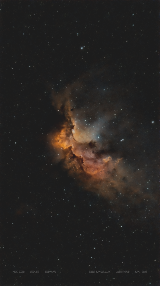 Bonjour à toutes et à tous, Voici une tentative sur la "Nébuleuse du Sorcier" dans la constellation de Céphée : j'ai pointé mes deux Seestar S50 sur 5 nuits du mois de mai avec des durées d'acquisition très variables suivant les conditions (Lune & voiles nuageux) pour un total de captures de 17 heures et 3 minutes (ramené à 16h49mn après les rejets sous Siril). Le traitement "conventionnel" (avec étalonnage des couleurs par photométrie ou spectrophotométrie) m'a donné un résultat qui ne me convenait pas du tout (dominante brun/rouge avec bien peu de détails révélés). J'ai donc repris tout ça avec un étalonnage "manuel" pour les couleurs et un résultat sans doute bien exotique mais plus convainquant quant au relief et définition obtenus. J'ai refais ce traitement un nombre incalculable de fois et je vous livre une version en étant bien conscient de son caractère très discutable ... ce sera peut être le déclic pour me mettre enfin à PixInsight. Cet objet me tient vraiment à cœur et j'espère que ces heures d'acquisitions ne seront pas à mettre à la poubelle NGC 7380 (Sh2-142) (Nébuleuse en émission - Céphée) Pradelles (Haute-Loire) Mai 2025 Lune variable de 40 à 75% - ciel dégagé à voilé Seestar S50 (x2) Total d'acquisition de 16h49mn après rejets Traitement Siril , Astrosurface, Seti Cosmic Clarity & Gimp Eric "appiantiqua" -