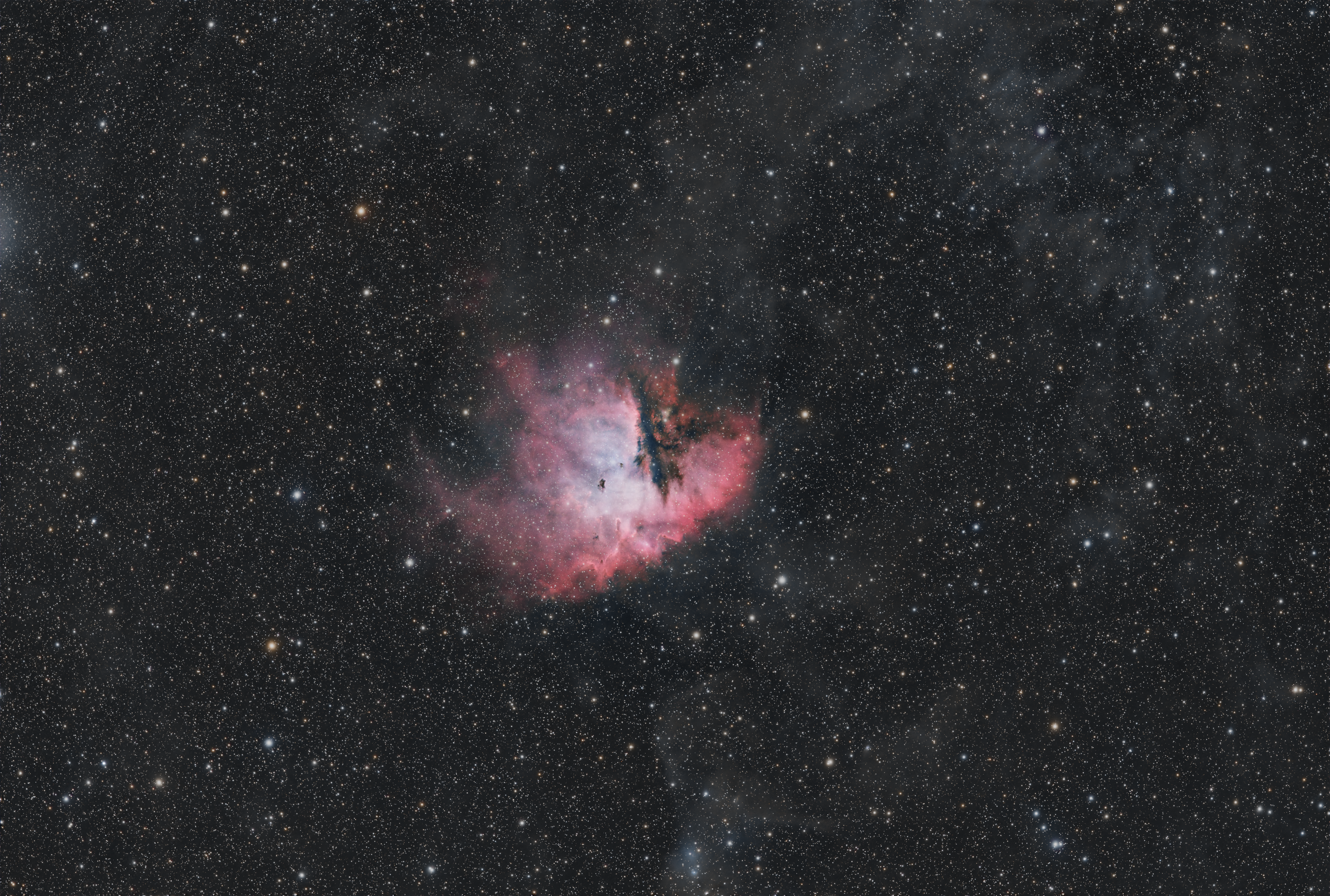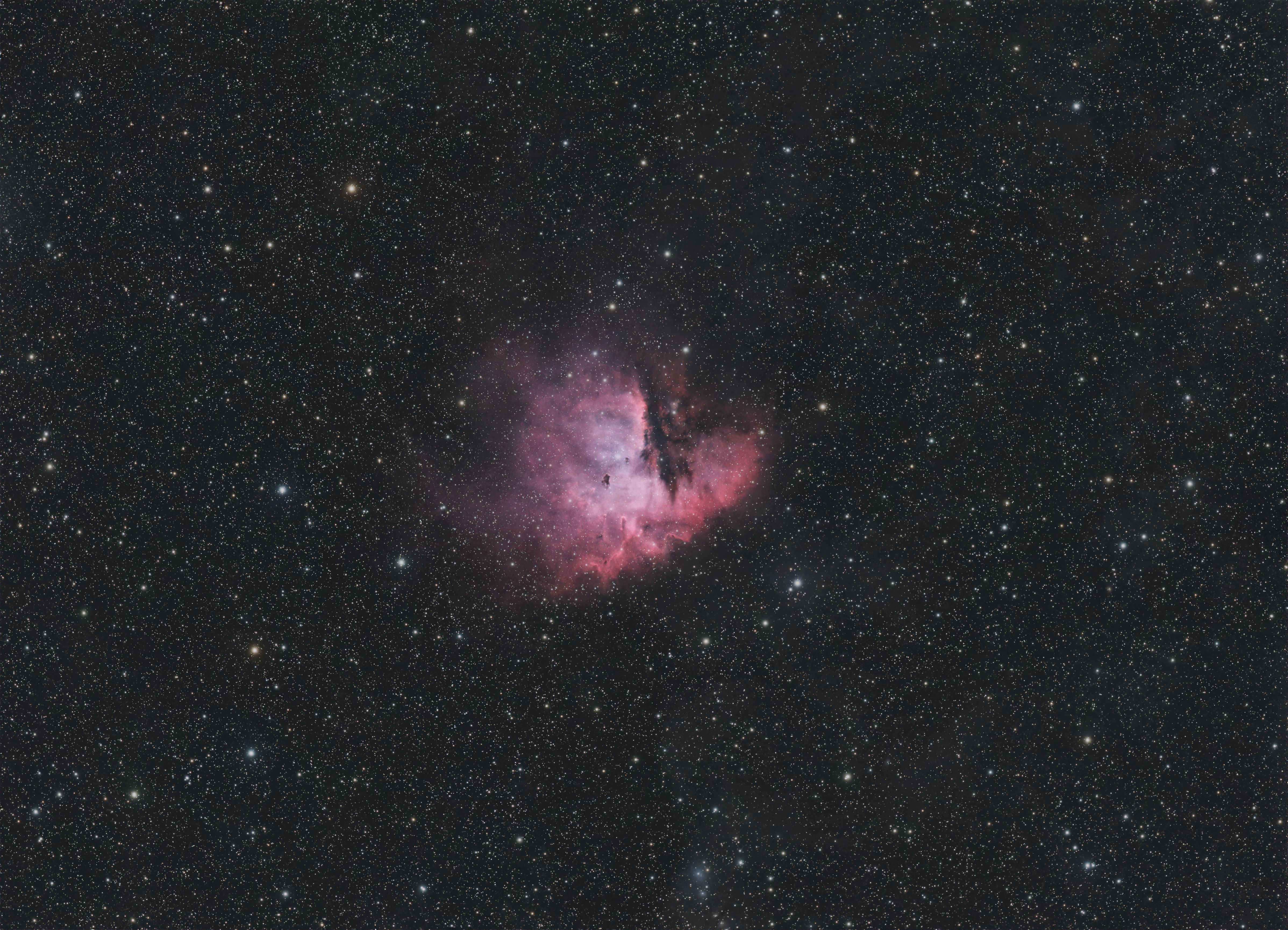 bonsoir à tous, une image de la nébuleuse Pacman datant du 5,6 et 11 Octobre dernier depuis ma Beauce. Le cadrage peut surprendre mais je voulais mettre LDN 1299 dans le champ ... j'avais juste oublié qu'elle ne ressortait pas du tout en Halpha, j'aurais du aussi faire des poses en luminance pure pour l'avoir Atik460ex + filtres HaRVB astronomik + fs60 à f/4.2 sur Ragdoll 17 Pro autoguidage en // avec zwo178mm + zwo30F4 Acquisitions NINA Ha 6nm : 49 x 300s en binning 1x1 RVB = 10 x 180s binning 2x2 prétraitement imageviewCA, siril traitements siril, photoshop, graxpert A la taille d'acquisition Annotation Siril : a+ stéphane