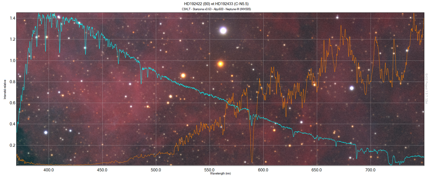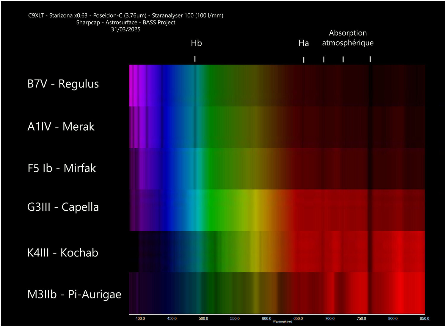 Bonjour ou bonsoir ! Voilà la suite de mes TP avec le Star Analyser 100 monté cette fois-ci sur mon C9XLT avec un réducteur Starizona x0.63 (0.65 en fait) et ma caméra CP, une Poseidon-C. La manip d'acquisition est relativement simple, capturer une étoile et son spectre arc en ciel avec Sharpcap par exemple. Il faut juste veiller à avoir la mise au point sur le spectre et ne pas le cramer. C'est comme pour du planétaire/lunaire, on capture un ser (200 images ici) puis on en fait un stack de 25 ou 50 images. J'ai comparé avec un traitement par DOF, ça n'améliore pas grand chose pour un Star Analyser 100. Mon objectif était de faire une compil des principaux types spectraux d'étoiles.. mais il m'en manque une d'un type qui ne court pas les rues en général et particulièrement en ce moment, celle de type O. On se reverra le moment venu. A la capture les différences se voient déjà : J'ai ensuite utilisé le logiciel BASS Project, moins simple que EasySpec dont j'avais parlé dans un post précédent mais le résultat est plus complet et plus en rapport avec ce que je cherche à faire. Il en sort les deux spectres ci-dessous et pour les explications : Wikipédia ! Le StarAnalyser ne permet pas d'avoir une résolution folle mais c'est pas mal du tout pour une découverte de la spectro. Et pour finir, la compil ! A bientôt peut être avec un nouveau TP -
