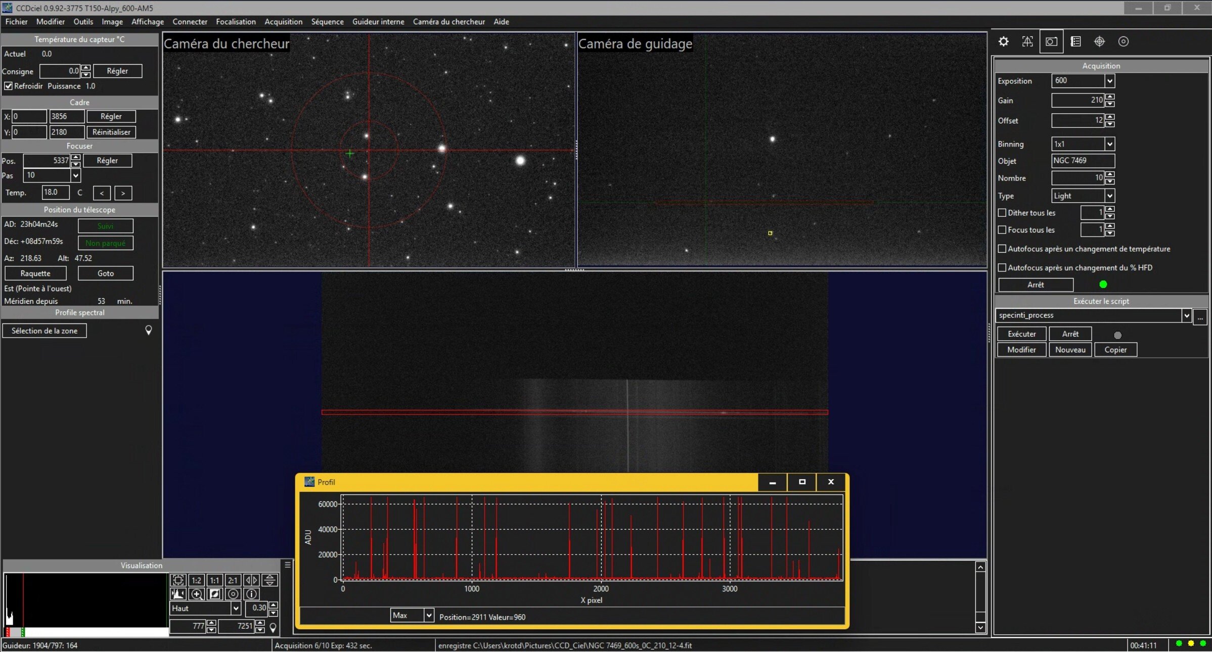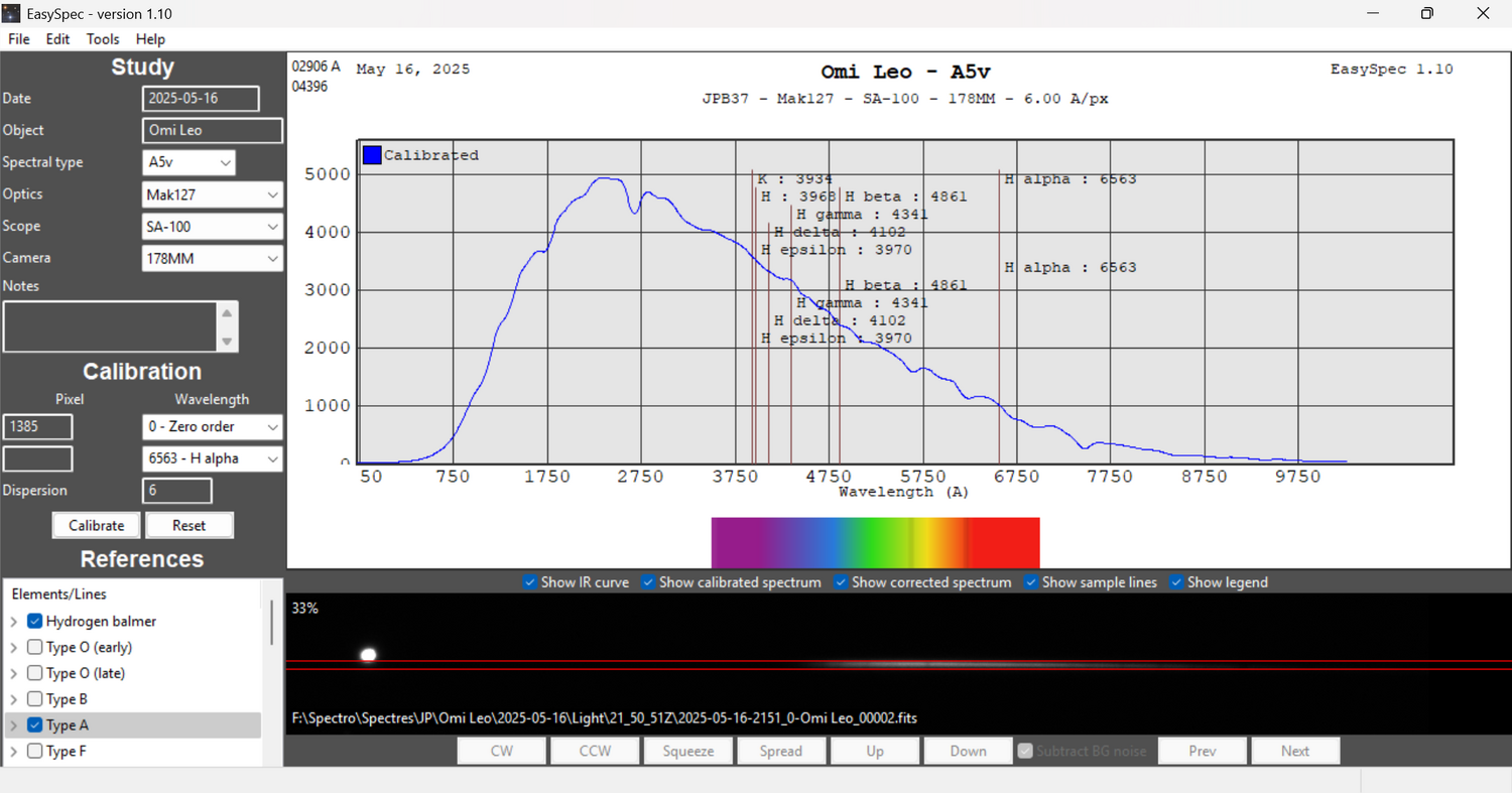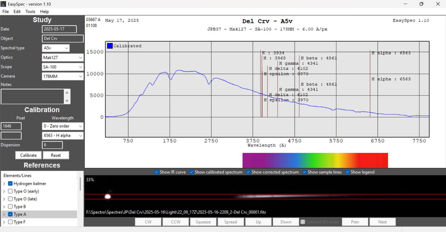 Bonjour à toutes et à tous Hier soir, j'ai pu profiter d'un ciel clair pour faire mes premiers essais avec le Star Analyser 100 reçu cette semaine, chose rare, en général quand on achète du matériel, le ciel fait la tête 🤬 Comme il est préconisé, je suis pari à la recherche de deux étoiles de type A. J'utilise le Mak127 qui va me servir aussi pour la spectro avec l'Alpy600 et l'Atik 414 EX que je viens de trouver d'occasion ici même et que j'ai reçu hier. Pour trouver ma cible, j'utilise N.I.N.A, je la pointe à l'aide de la lunette Svbony 165 montée en parallèle et équipée d'une QHYCDD 678C. Je sélectionne donc mon étoile avec Carte du Ciel, puis je me sers de l'assistant de cadrage de N.I.N.A. Une fois celle-ci centrée, je peux voir dans SharpCap l'étoile apparaitre dans la fenêtre de l'ASI 178MM. J'ai dû faire quelques réglages, notamment pour mettre le spectre à l'horizontal, pour cela j'utilise la bague fournie avec le Star Analyser que j'ai installé dans le nez de la l'ASI 178MM. Mon choix c'est donc porté sur Subra, ou Omicron Leonis dans le Lion, magnitude 3.520 et Algorab, ou Delta Corvi dans le Corbeau, magnitude 2.9 , toutes les deux de type A5.V J'ai eu aussi quelques hésitations au traitement, notamment pour la partie calibration que j'ai fais sur un point, connaissant la valeur de dispersion de mon matériel. Si vous voyez quelque chose qui cloche, n'hésitez pas à me le dire, je débute et je ne voudrais pas partir dans une mauvaise direction, surtout que je compte entrainer avec moi les membres de mon club.