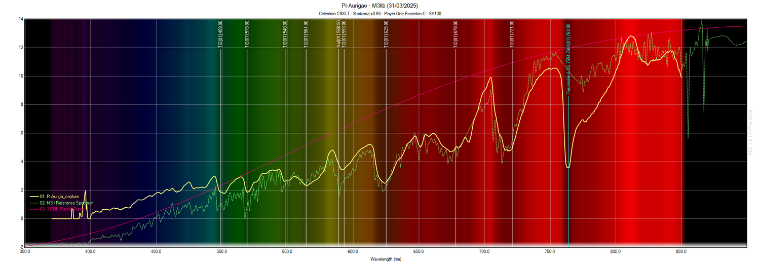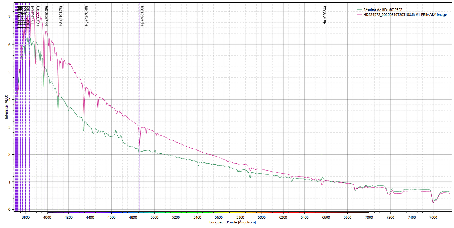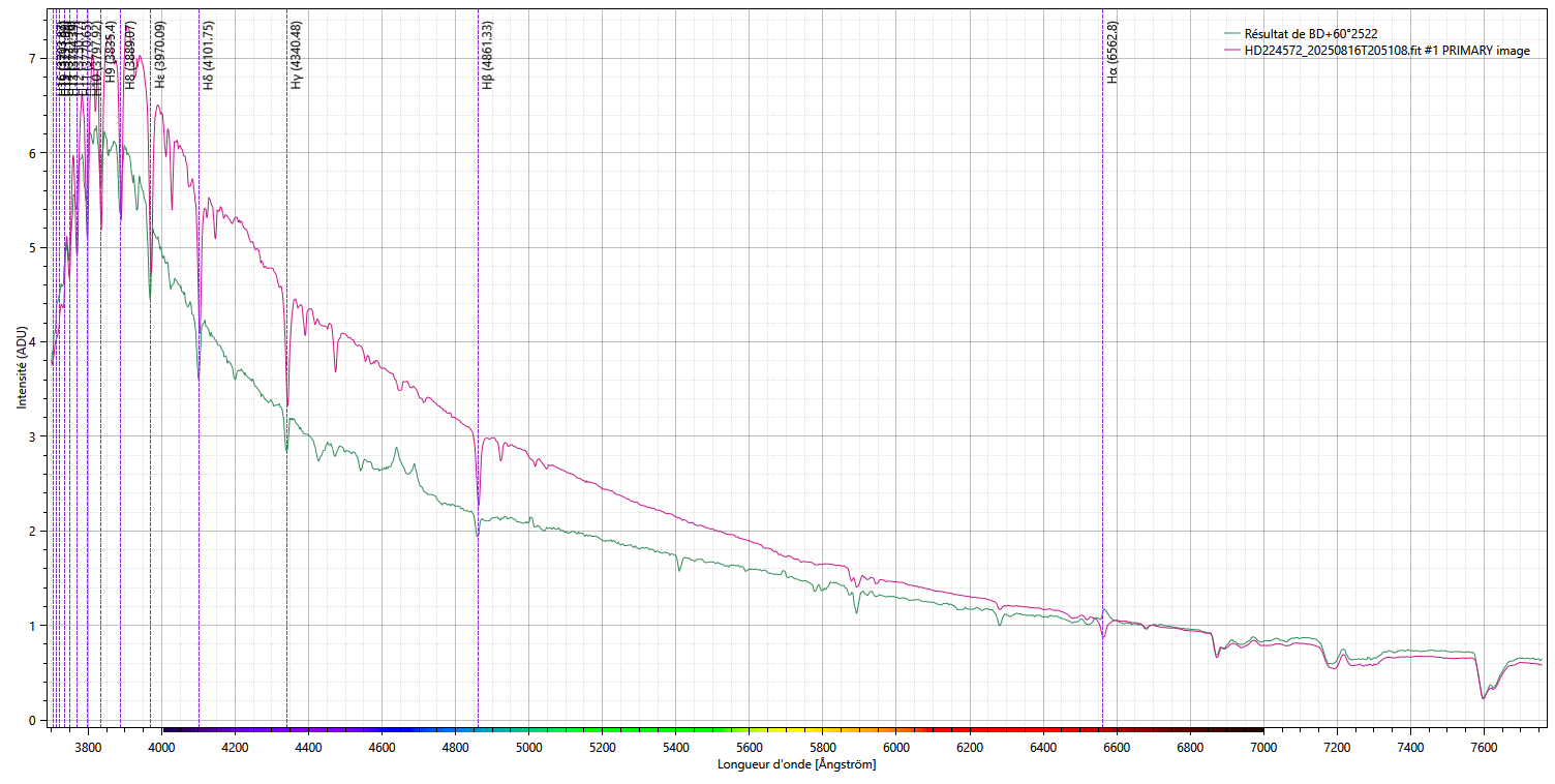 Bonjour à toutes et à tous Hier soir, j'ai pu profiter d'un ciel clair pour faire mes premiers essais avec le Star Analyser 100 reçu cette semaine, chose rare, en général quand on achète du matériel, le ciel fait la tête 🤬 Comme il est préconisé, je suis pari à la recherche de deux étoiles de type A. J'utilise le Mak127 qui va me servir aussi pour la spectro avec l'Alpy600 et l'Atik 414 EX que je viens de trouver d'occasion ici même et que j'ai reçu hier. Pour trouver ma cible, j'utilise N.I.N.A, je la pointe à l'aide de la lunette Svbony 165 montée en parallèle et équipée d'une QHYCDD 678C. Je sélectionne donc mon étoile avec Carte du Ciel, puis je me sers de l'assistant de cadrage de N.I.N.A. Une fois celle-ci centrée, je peux voir dans SharpCap l'étoile apparaitre dans la fenêtre de l'ASI 178MM. J'ai dû faire quelques réglages, notamment pour mettre le spectre à l'horizontal, pour cela j'utilise la bague fournie avec le Star Analyser que j'ai installé dans le nez de la l'ASI 178MM. Mon choix c'est donc porté sur Subra, ou Omicron Leonis dans le Lion, magnitude 3.520 et Algorab, ou Delta Corvi dans le Corbeau, magnitude 2.9 , toutes les deux de type A5.V J'ai eu aussi quelques hésitations au traitement, notamment pour la partie calibration que j'ai fais sur un point, connaissant la valeur de dispersion de mon matériel. Si vous voyez quelque chose qui cloche, n'hésitez pas à me le dire, je débute et je ne voudrais pas partir dans une mauvaise direction, surtout que je compte entrainer avec moi les membres de mon club.