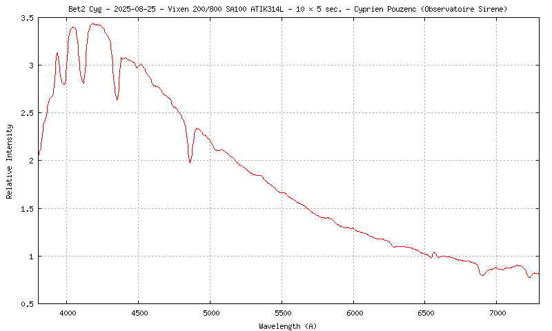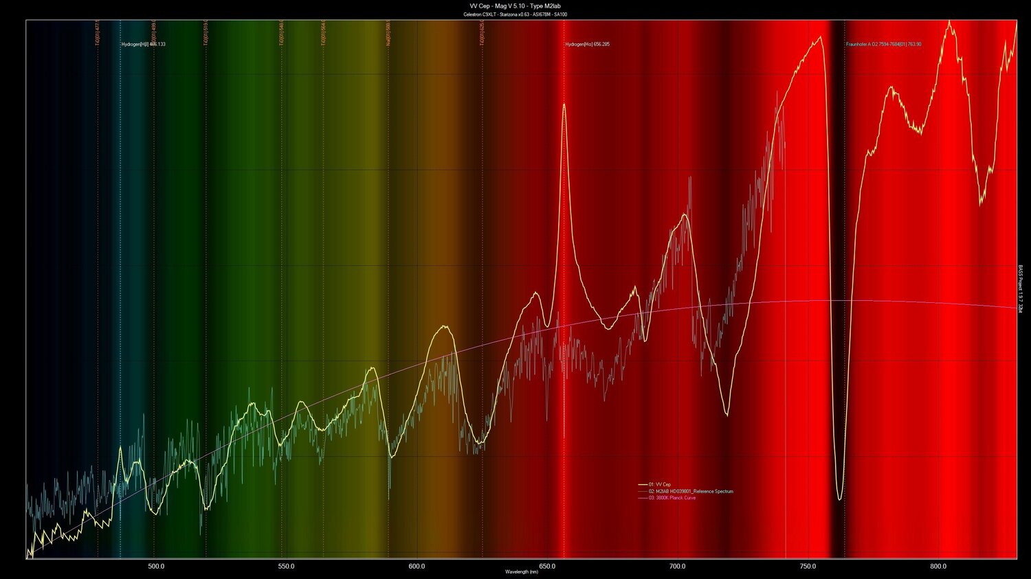 Salut ! C'est un mix de mon précédent post sur l'anneau de poussières autour d'une étoile et de mon objectif de sortir des jolis spectres d'étoiles froides. En cliquouillant dans Stellarium, je remarque une étoile avec un "e" comme émission dans son type spectral M (donc froide) et de magnitude atteignable par mon setup (5.10) : VV Cep. Twingo ! Firecapture, mon C9XLT + réducteur Starizona x0.63 + 678M en sortent cette image traitée avec Astrosurface (80 x 3"). La petite zone claire est bien là et elle est accompagnée des plusieurs zones sombres convoitées.. Traitement avec Bass Project, quelques bidouilles pour la présentation et voilà le résultat, l'émission en Ha et plus discrètement en Hb ainsi que les différentes absorptions propres aux étoiles de ce type : Wikipédia m'apprend que cette petite étoile dans Stellarium est en fait une véritable star : VV Cephei est une étoile binaire à éclipses située dans la constellation de Céphée à environ 4 900 années-lumière de la Terre. Elle contient une hypergéante rouge, VV Cephei A, qui est la troisième plus grande étoile actuellement connue et probablement la plus grande étoile visible à l’œil nu. Elle a un diamètre environ 1050 à 1900 fois plus important que celui du Soleil, ce qui fait 1 461 000 000 à 2 645 000 000 km de diamètre. Si elle était située à la place du Soleil dans le système solaire, elle s'étendrait, dans son estimation haute, presque jusqu'à l'orbite de Jupiter. Sa luminosité est comprise entre 200 000 et 575 000 luminosité solaire. Sa masse est inconnue mais estimée à partir de ses caractéristiques orbitales, elle serait de 100 masses solaires et à partir de sa luminosité, entre 25 et 40 masses solaires. Sa compagne VV Cephei B est une étoile bleue de la séquence principale qui est environ 14 à 20 fois plus grande que le Soleil et 100 000 fois plus lumineuse. Lorsque VV Cephei A est au plus proche de sa "petite" compagne VV Cephei B, elle perd de la matière à son profit ce qui se manifeste par les deux raies d'émission Ha et Hb. C'est tout pour aujourd'hui !