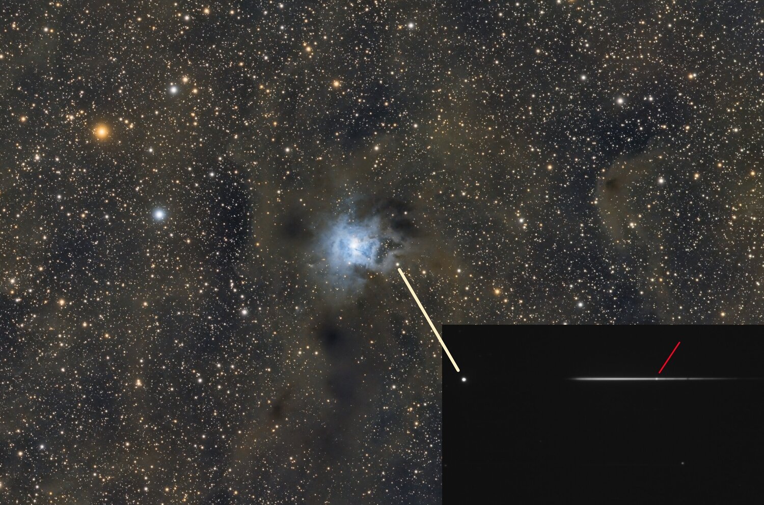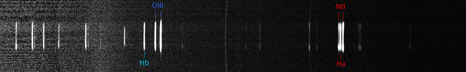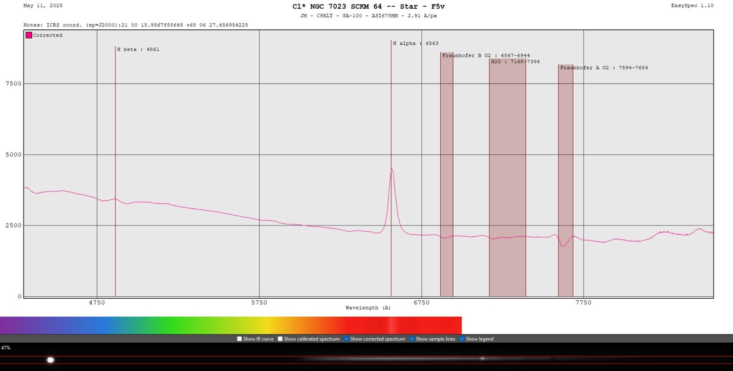 Salut ! Suite de mes TP au Star Analyser 100 avec un loupé qui finit bien L'idée de départ était de capturer le spectre de l'étoile au cœur de la nébuleuse de l'Iris (pour voir) mais l'imprécision de ma méthode m'a fait pointer à côté... Après recherches, c'est la petite étoile qui ne paye pas de mine. C'est sa signature qui m'a enduit d'erreur, la partie brillante du spectre. Traité avec EsaySpec, ça donne ça, un pic d'émission en Ha et un autre plus subtil en Hb (le SA100 n'est pas un spectroscope très sophistiqué..). Les trois raies d'absorption de Fraunhofer sont causées par notre atmosphère. Bon, bien.. et j'en fait quoi de ça ? Je vais voir mon cahier de TP sur le Star Analyser (https://rspec-astro.com/sample-projects/) et je vois qu'il s'agit de l'indice d'un anneau de poussière autour de l'étoile. Amusant je trouve C9XLT, ASI678M au foyer. SER de 50 x 20" avec Firecapture, Astrosurface pour le stack et EasySpec v1.10 pour le traitement.