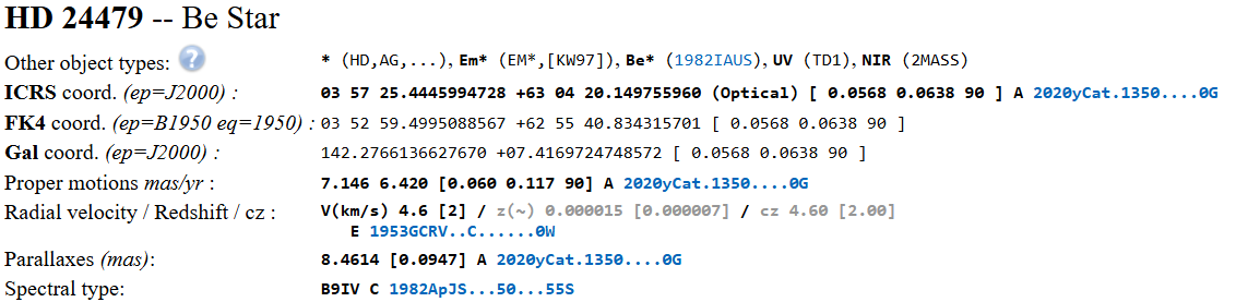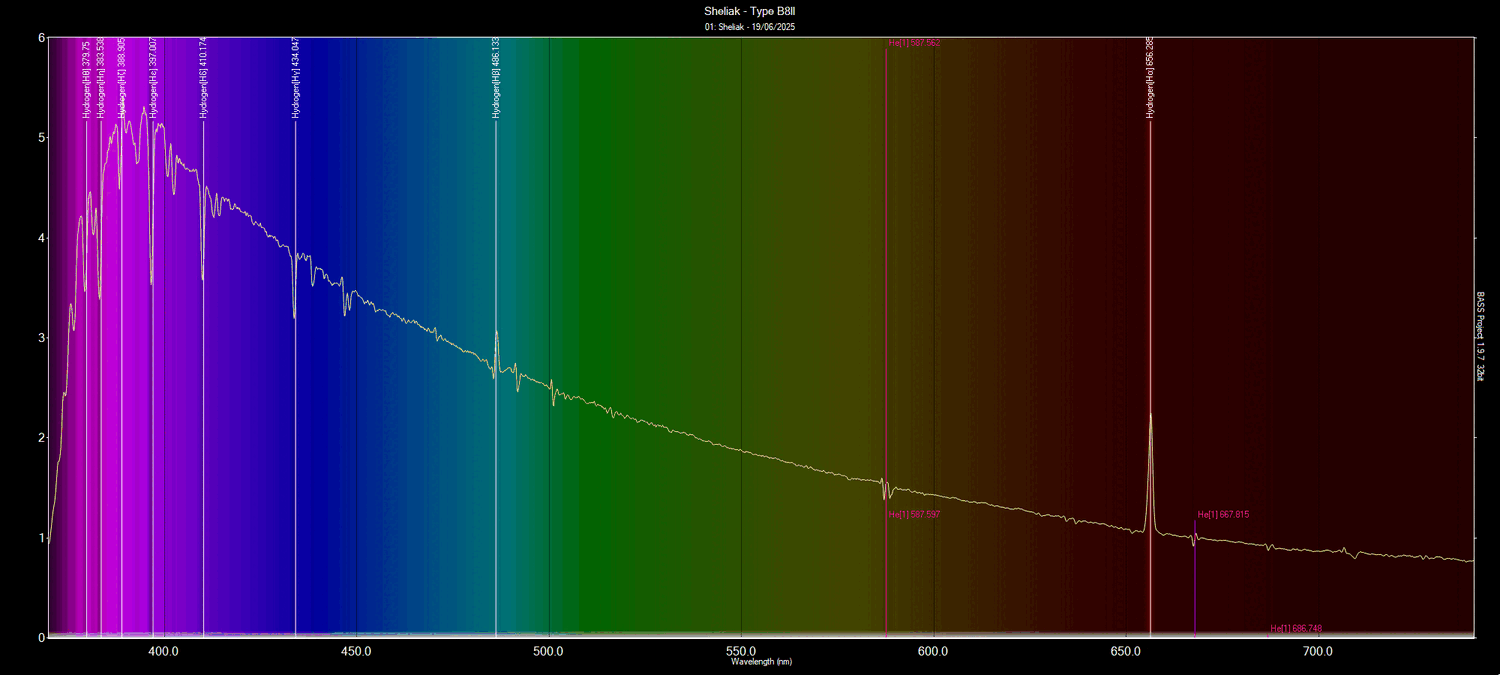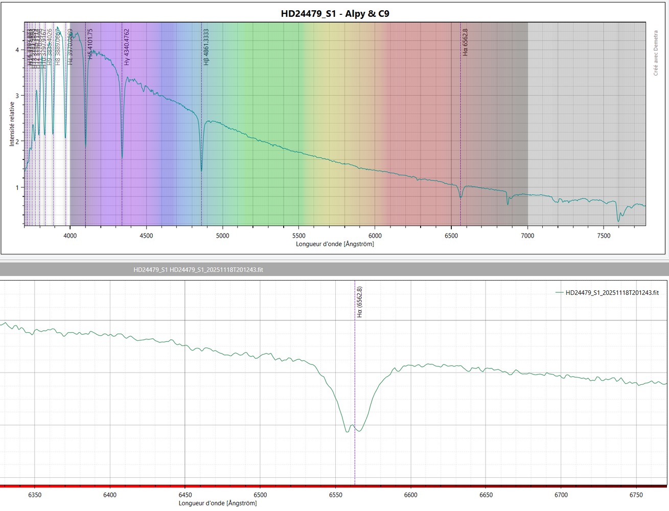 Salut à tous ! On connait tous ou à peu près tous l'étoile γ Cassiopeiae, Navi ou encore HD5394. C'est une étoile de type B, donc très chaude et très bleue. Son type spectral est plus précisément B0.5IVpe B0.5 : étoile chaude (≈ 25 000–30 000 K) IV : sous-géante e : présence de lignes en émission, signature d’un disque circumstellaire → comme une étoile Be classique (étoile de type B + raie en émission) p : signifie que le spectre présente des caractéristiques inhabituelles γ Cas est extrêmement variable avec une intensité de Hα fluctuante (formation/dissipation du disque) liée : à la rotation quasi-critique de l’étoile au “décret” de matière vers le disque à des instabilités dans le disque Comme γ Cas n'est pas dans la base des étoiles de référence qui servent à apporter des corrections aux spectres (la réponse instrumentale), je me suis servi d'une étoile proche dont le type est dans cette base (base Pickles) : l'étoile HD24479. Ce qui m'a amusé c'est que c'est une étoile Be qui montre en ce moment ce double pic sur la raie Ha et que je peux voir sur mon spectre basse résolution. C'est parfois quand on ne cherche pas qu'on trouve ! Et voilà pour Navi !