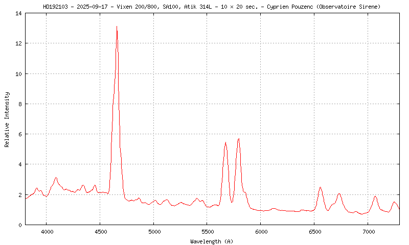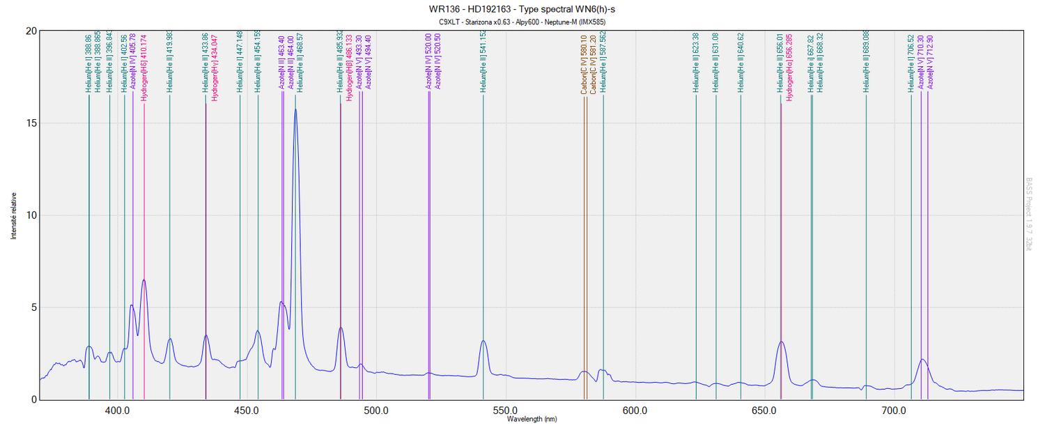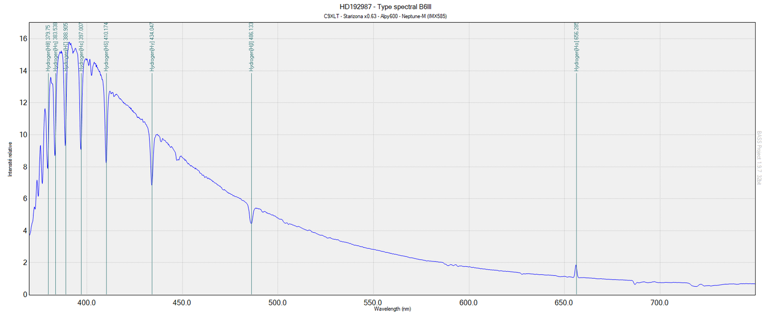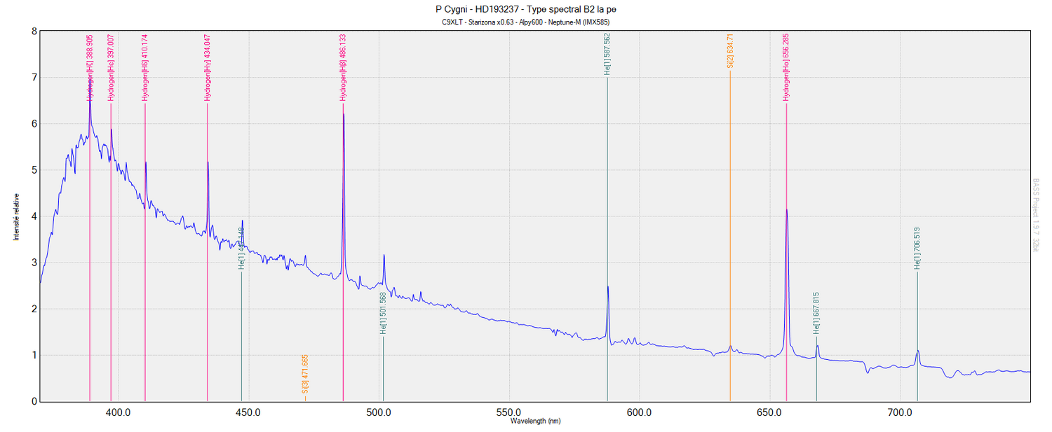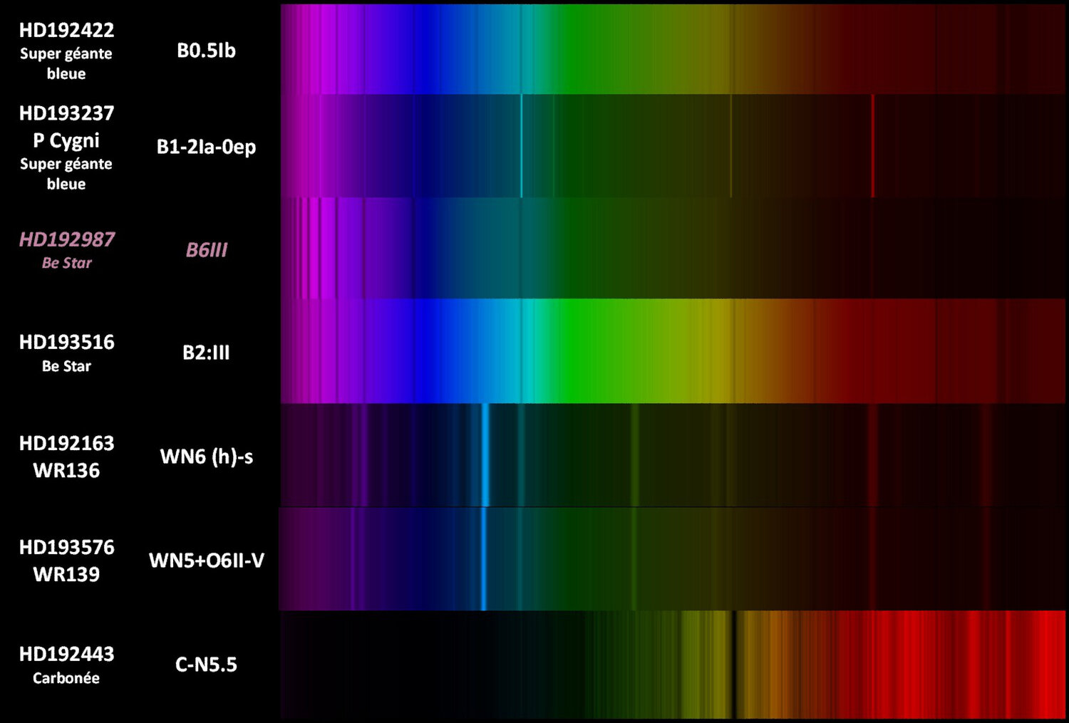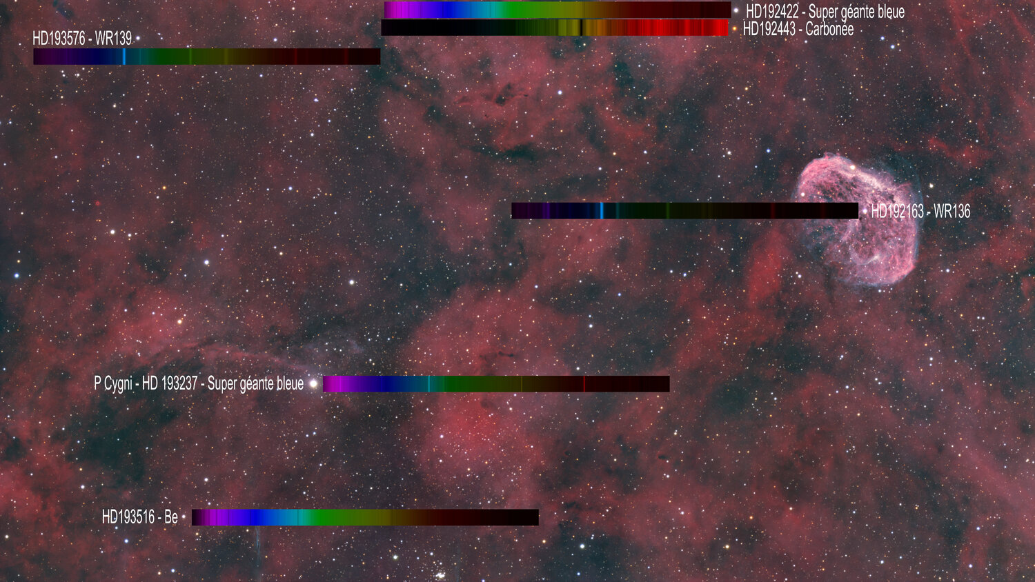 Bonjour à tous ! Voici la suite de mon image "Du Croissant à la petite NP pendant la pleine Lune" que j'avais présenté ici (clic-clic). Le script "What's In My Image" m'a permis de dresser une liste d'étoiles intéressantes et d'en faire le tri par type et magnitude apparente (il faut rester raisonnable). La nouvelle visite avec mon fidèle C9 et un Alpy 600 m'a donné ces spectres d'étoiles. Ce champ étoilé contient quelques merveilles ! WR136, l'étoile à l'origine de la nébuleuse du croissant. Le pic d'émission dans le bleu n'est pas de l'oxygène mais de l'hélium. Ce n'est pas le spectre de la nébuleuse mais celui de l'étoile ! La super géante bleue P Cygni aussi surnommée le revenant du Cygne.. Une étoile Be (type B avec raie en émission). Petite précision, ce n'est pas celle de la photo mais HD192987. Elle se situe juste en dessous du cadre inférieur car celle identifiée sur la photo ne montrait pas la raie Ha en émission attendue quand je l'ai capturée, pfff... Deux étoiles voisines (vues d'ici) bien différentes, une géante bleue (28 000 K) et une carbonée (3 779 K). Et pour finir, la compil des spectres (appelés 1D). J'espère que ça vous aura plu -