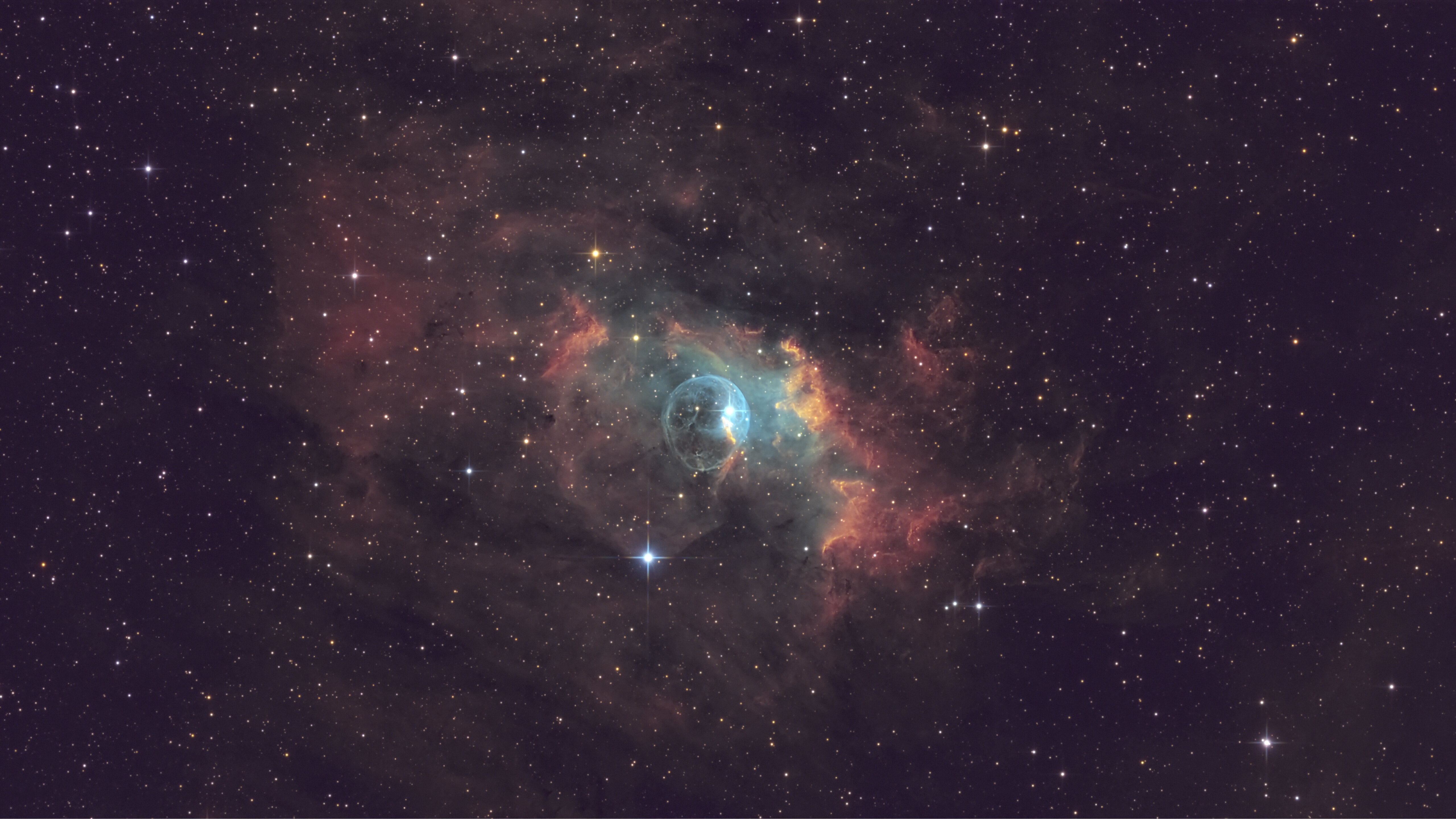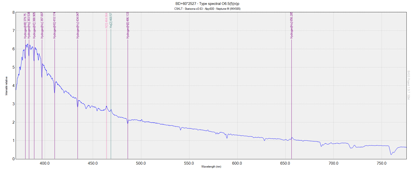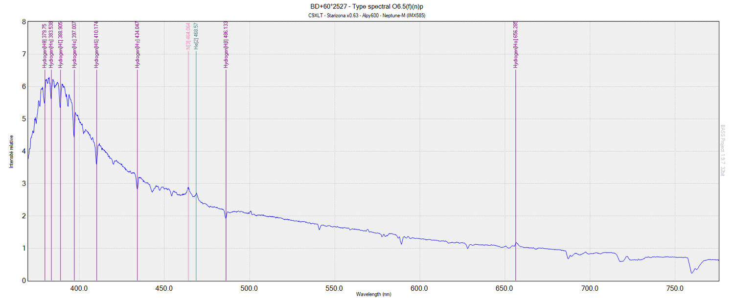 Salut à tous ! Et voilà la suite de la Bubble Hubble (clic-clic), la bulle au format de mon 150/750 (à 712 mm de focale avec le correcteur-réducteur x0.95) + Minicam8. Il y a les 11h30 de SHO + 3 x 30' de RVB pour les étoiles, du NINA, du Pix et de l'Affinity Photo 2. Elle est bien intrigante cette bulle avec sa flèche.. L'étoile BD+60°2522 est à l'origine de la formation de la Bulle, c'est une étoile de type spectral O.. et je n'ai pas encore pu faire de spectre d'étoile de type O qui sont assez peu nombreuses. Wikipédia : Les étoiles de type O sont très chaudes, très lumineuses et de couleur bleue. Ces étoiles possèdent des raies d'hélium intenses et des raies d'hydrogène Balmer assez faibles, elles émettent principalement dans l'ultraviolet. Ces étoiles sont si énergétiques qu'elles développent un fort vent stellaire et donc perdent de la matière qui forme alors des enveloppes donnant des raies en émission (type Oe pour les émissions dans l'hydrogène, type Of pour les émissions dans l'hélium II et l'azote III). BD+60°2522 est une étoile de type spectral O6.5(f)(n)p, rien que ça.. 🔹 1. La classe spectrale O : Les étoiles de type O sont les plus massives, chaudes et lumineuses de la séquence principale. Température de surface entre 30 000 et 50 000 K, couleur bleu très vif. Leur spectre est dominé par les raies de l’hélium ionisé (He II) et parfois d’autres ions très énergétiques (O III, N III, etc.). 🔹 2. Le sous-type 6.5 : Le chiffre affine la température à l’intérieur de la classe O, l’étoile est légèrement plus froide que O6 et plus chaude que O7, température typique ~39 000 K. 🔹 3. Le suffixe (f) : il décrit certaines émissions spécifiques dans le spectre, présence de raies He II à 4686 Å en émission, présence de raies de l’azote N III autour de 4634–4642 Å en émission. Cela indique des vents stellaires puissants et un rayonnement UV intense. On retrouve ce marquage chez de nombreuses étoiles O très massives. 🔹 4. Le suffixe (n) : Le n signifie que les raies spectrales sont élargies (en anglais nebulous). Cet élargissement est causé par une forte rotation stellaire → les raies spectrales sont « floues » à cause de l’effet Doppler. Dans le cas de BD+60°2522, la vitesse de rotation mesurée est entre 178 et 240 km/s. Un spectro haute résolution le montrerait mieux, l'Alpy 600 est un basse résolution.. 🔹 5. Le suffixe p : pour peculiar → spectre atypique ou particulier. Cela signale que l’étoile présente des caractéristiques inhabituelles qui ne correspondent pas exactement aux standards des autres étoiles de type O (variabilité, anomalies chimiques, structure du vent stellaire, etc.). J'ai donc permuté le KTT pour le KTS, le Krotdebouk Terrestrial Spectroscope (C9XLT/Starizona x0.63 + Alpy 600 + IMX585M). Le spectre est un stack de 15 x 180". Il correspond bien à l'attendu, raies d'hydrogène Balmer faibles et émissions hélium (He) + Azote (N).. et même en Ha. A titre de comparaison, l'étoile de référence qui permet de prendre en compte la réponse instrumentale pour corriger le spectre (HD224572) est une étoile de type B (B1V), les raies d'hydrogène Balmer sont plus prononcées (les étoiles sont principalement classées des plus chaudes aux plus froides en O, B, A, F, G, K et M). BD+60°2522 façonne la Nébuleuse Bulle grâce à son vent stellaire puissant créant un front de choc dans le milieu interstellaire. Cette bulle est née il y a environ 40 000 ans, bien que l’étoile elle-même soit beaucoup plus vieille. NGC7635 est une des nébuleuses à bulles les plus spectaculaires du ciel. Elle apparaît excentrée par rapport au centre de la bulle en raison des variations de densité du nuage environnant. L'étoile aurait déjà perdu environ un quart de sa masse initiale et se trouve à peu près à mi-chemin de son cycle de vie dans la séquence principale. Elle devrait finir sa vie en supernova dans quelques millions d’années... Sniff !