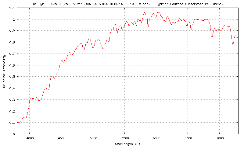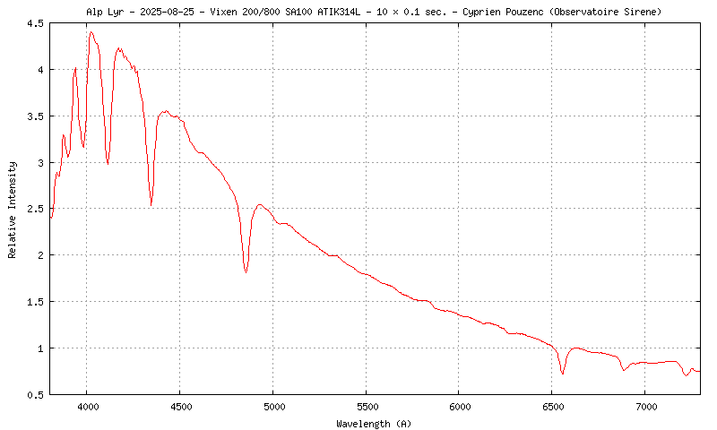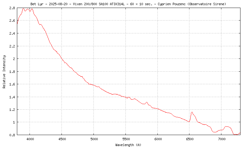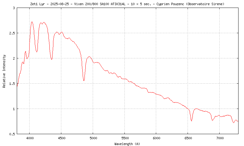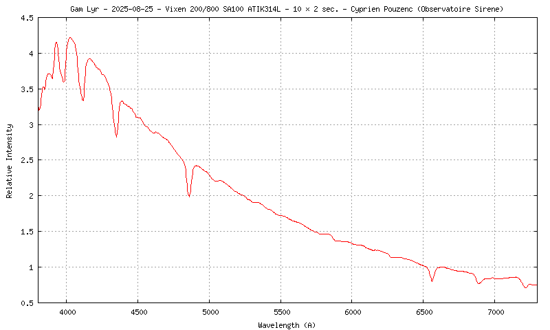 Bonjour à tous ! Ca faisait un petit moment que j'avais posté quelque chose. Je découvre la spectroscopie et son matériel (essai/echec..etc) ainsi qu'une nouvelle caméra pour les images d'ambiance (re-essai/re-echec..etc) Après la phase de montage/réglage/découverte du spectroscope et des logiciels avec des étoiles simples, voilà un exercice un peu plus fouillé avec B Lyrae (Aa1), Sheliak de son petit nom. C'est une binaire à éclipse et variable, l'étoile bien brillante en bas à gauche de la photo toute neuve de cette nuit. Sa copine (B Lyrae Aa2) n'est pas visible, elles sont trop proches pour nos instruments même les très très grands ! FRA300 + MiniCam8 (60 x 30" en R/V/B) - NINA, Pix Les deux étoiles sont d'ailleurs assez proches pour que la matière de la photosphère de l'une (Aa1) soit attirée vers l'autre (Aa2). Le signe sur son spectre c'est (ce sont ?) les deux raies d'émission en Ha et en Hb. Il se passe également quelque chose sur la raie de l'hélium (5876 A) avec deux explications, une émission et une absorption ou un effet Doppler comme ce qu'on peut voir sur le spectre de Nova Lup 2025 posté sur WA (clic). C9XLT + Réducteur Starizona X0.63 + Alpy 600 + Player One Uranus-M (IMX585) - NINA + Demetra Comme j'aime bien la couleur, le spectre 1D (une dimension: plat). Visual Spec Quelques caractéristiques clés des étoiles type Beta Lyrae : · Proximité des composantes : Les deux étoiles sont très proches, souvent si proches que leurs enveloppes externes se touchent ou interagissent, formant une structure en forme de larme ou de halo autour du système. · Variabilité de la Lumière : La luminosité de ces systèmes varie de manière continue en raison de la déformation des étoiles et des éclipses mutuelles. Les courbes de lumière de ces étoiles montrent des variations régulières et périodiques. · Période Orbitale : Les périodes orbitales des étoiles de type Beta Lyrae sont généralement courtes, allant de quelques heures à quelques jours. · Transfert de Masse : Dans de nombreux cas, il y a un transfert de masse d'une étoile à l'autre, ce qui peut conduire à des phénomènes complexes tels que des disques d'accrétion et des jets de matière. · Spectre : Les spectres de ces étoiles montrent souvent des raies d'émission et d'absorption complexes en raison des interactions entre les deux étoiles et des mouvements de matière dans le système. Et puisqu'elle est variable, j'ai capturé son spectre sur 3 nuits, les 19, 21 et 24 juin puis j'en ai sorti une animation. Ca bouge ! Bass Project Et voilà !.. Mais ça serait pas M57 que je vois au milieu de la photo