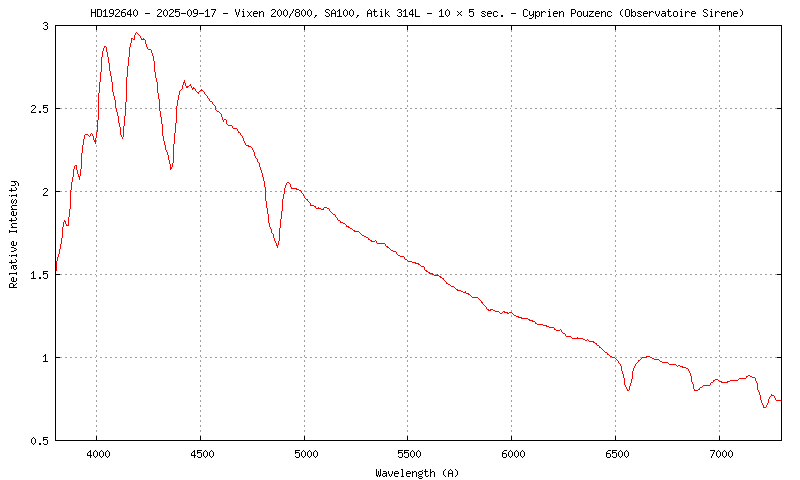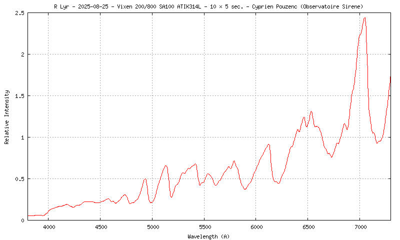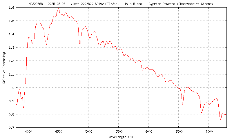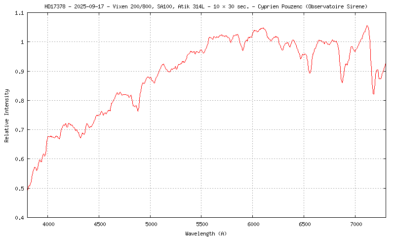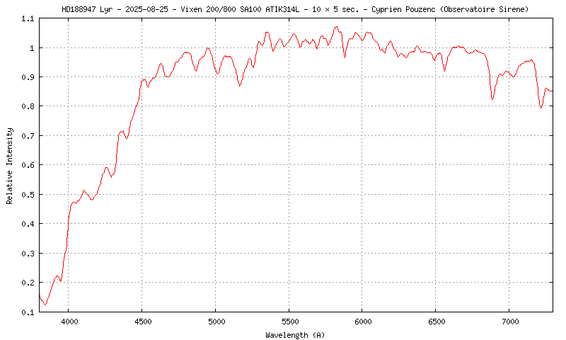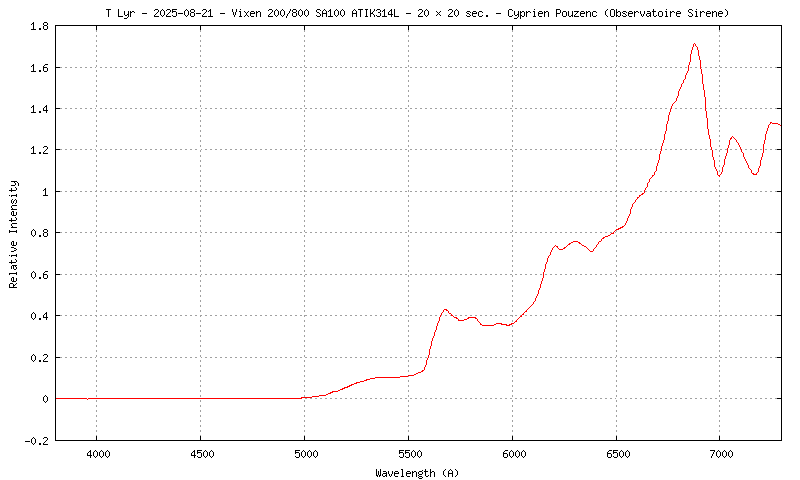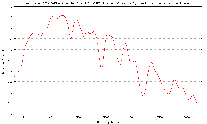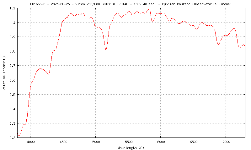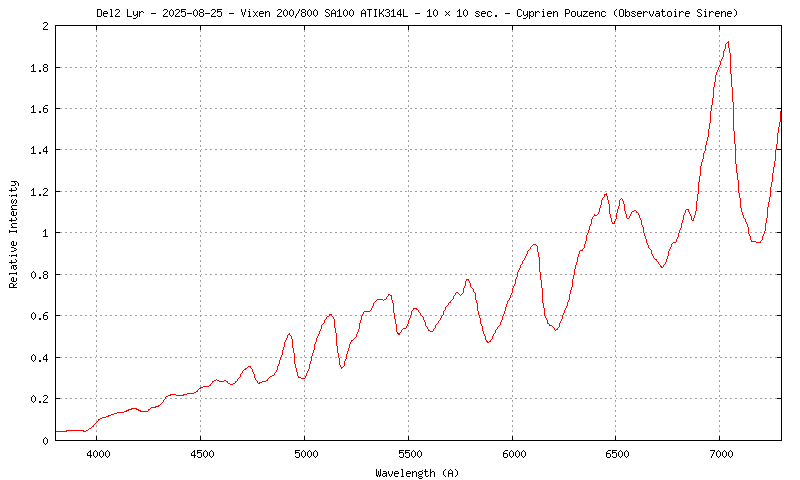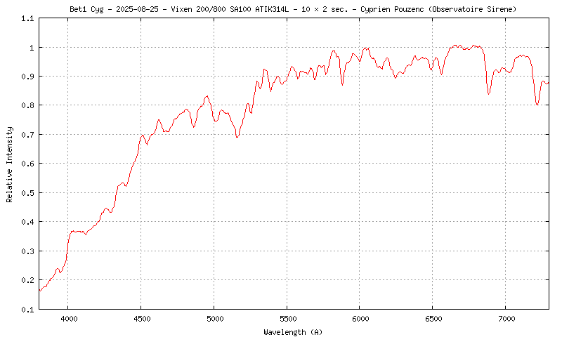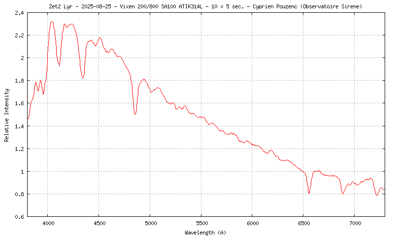 Salut à tous ! Cela faisait longtemps qu'on avait acheté un réseau de diffraction StarAnalyser 100 pour découvrir le monde merveilleux de la spectroscopie, mais on n'avait jamais pris le temps ni vraiment eu les moyens de le mettre en œuvre. Lors de mon dernier passage à l'Observatoire Sirene fin août, j'ai entrepris d'adapter un instrument à cet usage. C'est donc sur un T200/800 Vixen monté sur monture Trassud ZX4 que le réseau de diffraction a été installé, devant une caméra Atik 314L. En fait, l'instrument a été modifié plus profondément que cela. La L80/600 Skywatcher 80ED montée en parallèle a été équipée d'une caméra Datyson T7M au foyer pour le guidage (inutilisé ici). La monture a été équipé d'un contrôleur OnStepX. Le tout est contrôlé par un Raspberry Pi 4 sous Astroberry. Un écran à flat à lumière naturelle a été installé au fond de l'abri, face à la position parking du télescope. Un interrupteur de fin de course a été installé sur l'un des rails de l'abri roulant. Relié au contrôleur de monture, il permet de limiter les mouvement de la monture lorsque l'abri est fermé. Une caméra IP a été installée dans l'abri. Le tout est connecté au réseau wifi. À l'ouverture de l'abri près, l'ensemble est donc contrôlable à distance 🎉 Les premières acquisitions ont été réalisées à distance depuis la véranda de l'observatoire. C'est super enthousiasmant de s'initier à une nouvelle pratique astro 🤗️ Y a plein de choses à améliorer, mais c'est déjà très fun 😊️ J'ai suivi le tutoriel de Christian Buil pour découvrir la réduction des données issues d'un StarAnalyser avec ISIS (cf. https://buil.astrosurf.com/isis/quicksa/tuto_fr.htm). Voici donc les résultats de mes premiers travaux pratiques 😊 Profil de Beta Lyr, alias Shelyak, étoile chaude de type B au profil vers la gauche (vers le bleu). On voir bien l'émission Ha à 6563 Å (et He I à 5876 Å ?) propre à cette étoile. Spectre de synthèse de Bet Lyr, issu de VisualSpec. Profil de T Lyr, étoile froide carbonée, au profil vers la droite (vers le rouge). Le spectre est « creusé » par l'absorption due aux molécules de TiO propres aux étoiles carbonées. Spectre de synthèse de T Lyr. Spectre de M 57. Étirement de l'histogramme sous Siril. On voit bien les images de M 57 en Ha et OIII, ainsi qu'en d'autres longueurs d'onde. Le champ est couvert des spectres d'autres étoiles. Profil de Alpha Lyr, alias Véga, étoile chaude de type A0V. Les raies d'absorption de la série de Balmer de l'hydrogène sont bien visibles. Spectre de synthèse de Alp Lyr. Profils de Beta1 et Beta2 Cyg, alias Albiréo. Bet1 est froide avec un profil vers le rouge, de type K3II, tandis que Bet2 est chaude avec un profil vers le bleu, de type B8Ve. Bet2 présente également une belle série de Balmer, avec la raie Ha ici légèrement en émission (étoile de type Be). Spectres de synthèse de Bet1 et Bet2 Cyg. Même exercice avec une autre étoile double, Del1 et Del2 Lyr, de types B2V et M4II. Spectres de synthèse de Del1 et Del2 Lyr. Profil de Gam Lyr, de type B9III. Profil de HD166620, de type K2V. Profil de Eta Cyg, de type K0III. Profil de Iot Psc, de type F7V. Profil de R Lyr, de type M5III. Profil de The Lyr, de type K0II. Profils de Zet1 et Zet2 Lyr, de types A4m et F0IV. Spectres de synthèse correspondants, mis dans l'ordre des types spectraux, des étoiles les plus chaudes aux plus froides. Del1 Lyr, B2V Bet2 Cyg, B8Ve Gam Lyr, B9III Alp Lyr, A0V Zet1 Lyr, A4m Zet2 Lyr, F0IV Iot Psc, F7V The Lyr, K0II Eta Cyg, K0III HD166620, K2V Bet1 Cyg, K3II Del2 Lyr, M4II R Lyr, M5III T Lyr, C-J4 Profil de P Cyg, très particulier, avec une grosse émission en Ha (et d'autres raies en émission également). Spectre de synthèse de P Cyg. Profil de Neptune, avec de grosses bandes d'absorption dues au méthane dans son atmosphère. Spectre de synthèse de Neptune.