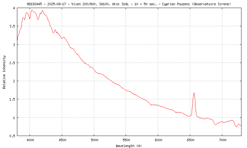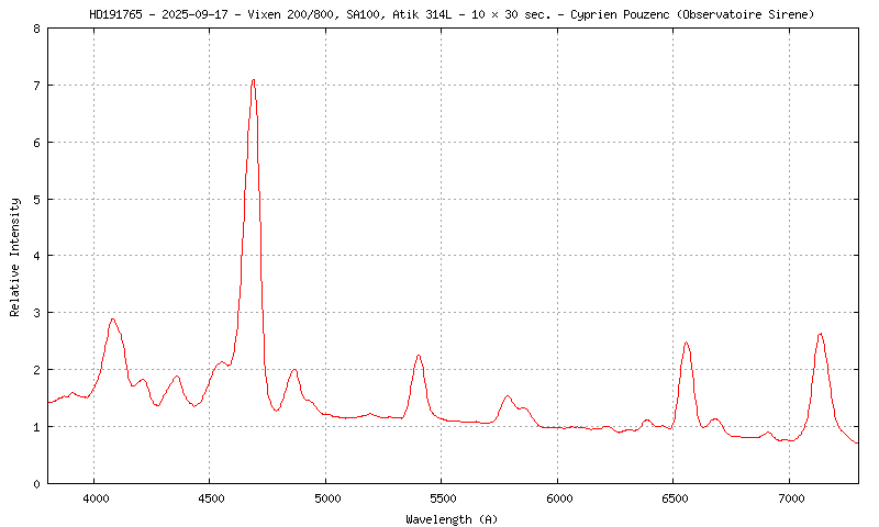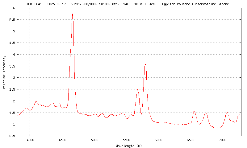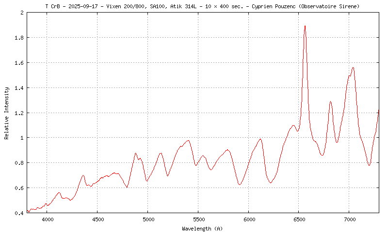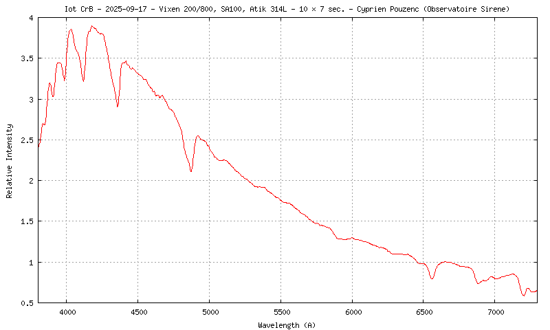 Salut à tous ! Suite aux débuts en spectro au Star Analyser 100 depuis l'Observatoire Sirene décrits dans un précédent sujet, voici les résultats d'une deuxième séance, cette fois opérée à distance depuis la maison 😊 Bon, j'ai quelques problèmes de connexion avec la caméra CCD voire avec la monture lorsqu'elle perd le wifi, mais sinon ça marche pas trop mal. Un grand merci à Solange qui ouvre et ferme manuellement l'abri, qui titille les câbles pour retrouver la caméra lorsqu'elle déconne, voire qui éteint et rallume l'alimentation ou qui recale le télescope en position parking 😊 L'autoguidage fonctionne lui plutôt bien 😃 J'ai coupé la caméra IP. Elle crachait un peu trop d'infrarouges et ça me pourrissait les darks 😅 Le contrôle de la monture paraît plutôt fiable, je ne surveille donc pour le moment plus visuellement ses déplacements. Le réglage du Star Analyser est à revoir, ça a dû bouger depuis mon départ. J'essaie de positionner mes cibles en bas à droite de l'image, là où ça semble le moins pourri 😒 Acquisition et autoguidage sous CCDCiel, réduction des données sous ISIS, graphiques et spectres de synthèse réalisés sous VisualSpec. Comme il me l'a été suggéré, j'ai fait un petit tour du coté de T CrB, dont la prochaine éruption en Nova est très attendue d'ici quelques semaines ou mois, d'après ce que j'ai compris. Profil de T CrB, étoile binaire symbiotique et nova récurrente d'une période de 80 ans, de type M3IIIe. Émission bien marquée de la raie Ha à 6563 Å. Spectre de synthèse de T CrB. Profil de Iot CrB, de type A0III. Il s'agit de mon étoile de référence pour étalonner et corriger la réponse instrumentale du spectre de T CrB. Spectre de synthèse de Iot CrB. Pour ma collection de types stellaires, je voulais une étoile très chaude de type O. Bon, je me trompe de cible, mais ça va, coup de chance, c'était aussi une étoile de type O 😅 Par contre je suis déçu. Je pensais que la pente du profil serait encore plus forte que pour les étoiles de type B ou A comme la précédente (du haut de ma grande expérience d'un jour en spectro, hein 😂) mais non, c'est très plat. Erreur de ma part ? Profil de HD15558 de type O5.5III. Spectre de synthèse de HD15558. D'ailleurs, mon étoile de référence, HD17378, de type A5Ia, ne ressemble pas non-plus aux précédentes étoiles de type A observées... Si quelqu'un a une explication. Et comme c'est mon étoile de référence, en cas de problème ici, il se répercuterait évidemment sur le profil de la précédente. Profil de HD17378, de type A5Ia. Spectre de synthèse de HD17378. Je suis ensuite parti en quête d'une dernière étoile avant de fermer pas trop tard, cette fois de type Wolf-Rayet. Il s'agit d'une étoile de type O ou B en fin de vie, qui a soufflé une belle partie de son atmosphère. Tellement, en fait, qu'on ne voit plus le spectre de l'étoile elle-même mais de la coquille de gaz chaud expulsé qui l'entoure. Et c'est beau 🤩 Profil de HD192103, de type WC8, avec notamment les fortes raies d'émission C[III, IV] à 4650 Å, C[III] à 5696 Å et 6724 Å, C[IV] à 5808 Å et Ha à 6563 Å. Avec d'autres raies plus faibles de ces mêmes éléments, mais également de He et He[II]. Fortes raies du Carbone, donc, typique des WR de type WC (genre le mec fait semblant de savoir de quoi il parle 😆). Spectre de synthèse de HD192103. Incroyable 🤩️ Bon, c'est là que ça dérape 🤪 Faut aller me coucher pour me lever tôt demain, alors... oh tiens, y a une autre WR dans le champ. Profil de HD191765, de type WN6, différent du précédent, donc, avec notamment les fortes raies d'émission N[IV] à 4057 Å et 7115 Å, He[II] à 4340 Å, 4541 Å, 4686 Å, 4861 Å et 5411 Å, C[IV] à 5808 Å, He à 5875 Å et Ha et He[II] à 6563 Å. Beaucoup d'Hélium et d'Azote, typique des WR de type WN. Spectre de synthèse de HD191765. C'est quand même dingue. Bon allez, déconne pas, je fais mon étoile de référence et au dodo. Profil de HD192640, de type A0.5Va. Spectre de synthèse de HD192640. Nickel, je parque le télescope et... ooooh, y a une autre WR toute mignonne dans le champ 😍 Profil de HD192641, de type WC7, similaire à celui de HD192103. Spectre de synthèse de HD192641. Et là, c'est complètement fou. En rédigeant ce message, je me rends compte que j'ai ainsi reproduit, et complètement par hasard, la triple observation historique des étoiles HD192103, HD191765 et HD192641 qui a mené à la découverte de ce type d'objet par Wolf et Rayet en 1867. C'est dingue 🤪️️ J'ai juste 158 ans de retard, quoi 😄️️ Allez, assez blablaté, cette-fois je vais me cou... mais mais, c'est trop mimi cette raie d'émission là, y a une jolie étoile Be juste à coté ! Profil de HD192445, de type B0.5III. Spectre de synthèse de HD192445. Bien bien bien 🥰 Oh tiens, c'est 2h30 du mat'. Et meeerde 🤪 -