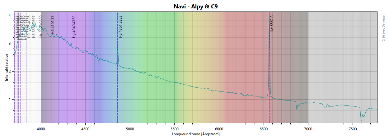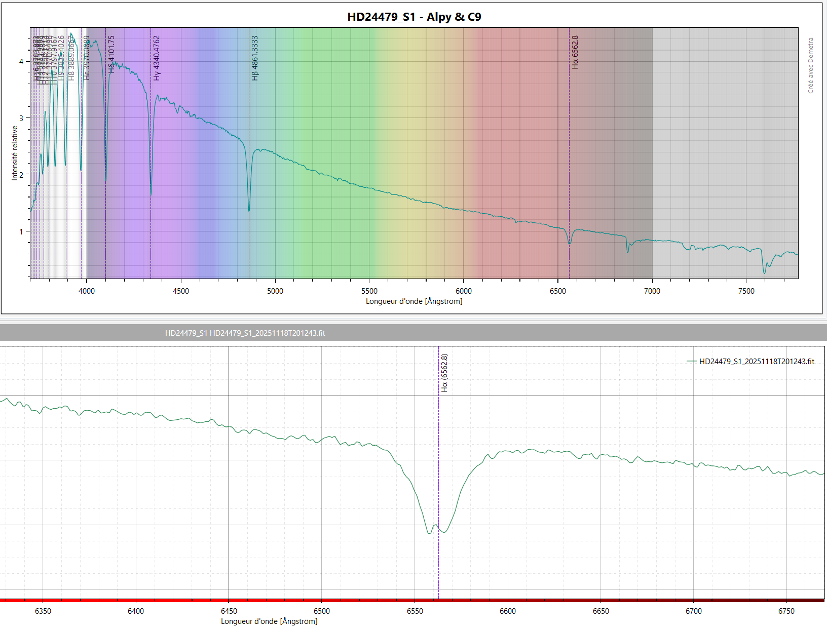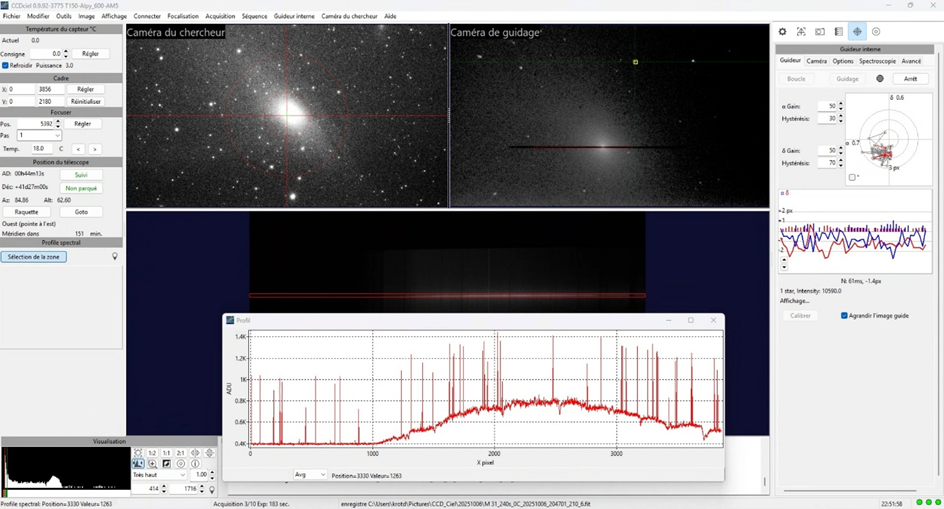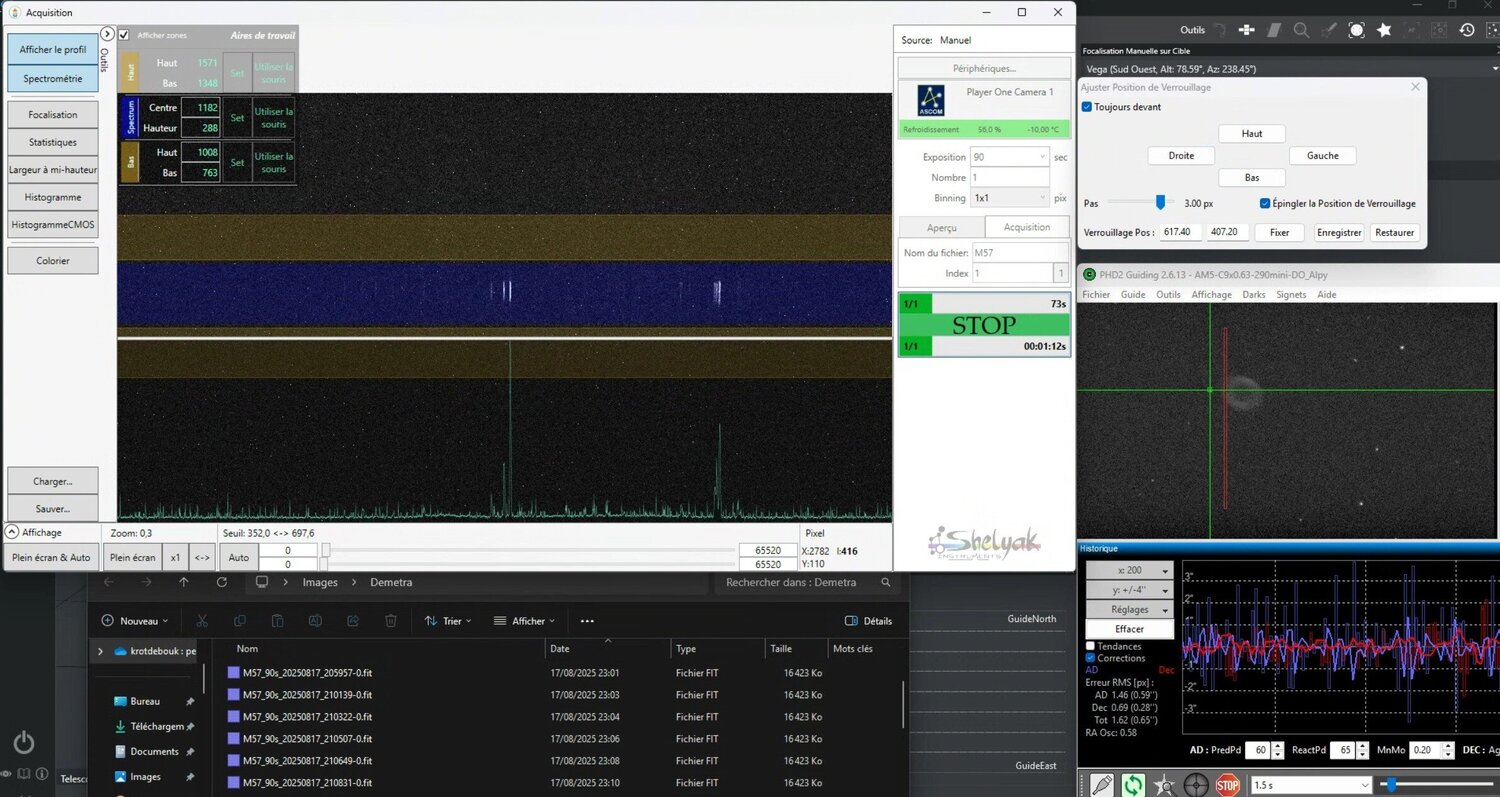 Salut à tous ! Pause astrophoto. Depuis le temps que je tournais autour du truc, ce qui devait arriver est arrivé, un spectro Alpy 600 m'a rejoint. Il succède au Star Analyser 100 qui est un excellent moyen de mettre le doigt dans la machine... Mon setup dédié spectro est donc composé de mon fidèle C9XLT + réducteur Starizona x0.63, un Alpy 600 avec module de calibration et de guidage (Shelyak Instruments), une Player One Uranus-M Pro au capteur IMX585. Après quelques heures de montages, démontage, remontage, redémontages, auto-insultes , le setup a enfin fini par être opérationnel Premier spectre de validation avec la brillante Véga. Si l'aventure vous tente ou titille votre curiosité, je vous recommande la lecture de deux excellents livres : le "Guide pratique pour (bien) débuter en spectroscopie astronomique (François Cochard)" et "10 expériences de spectroscopie astronomique (Olivier Garde)".. à compléter évidemment par les vidéos Youtube qui ne manquent pas. En fait j'ai commencé par la lecture des 10 expériences de spectro, c'est lui le plus dangereux financièrement. Il vous amènera sur "comment débuter en spectro", puis etc... A bientôt