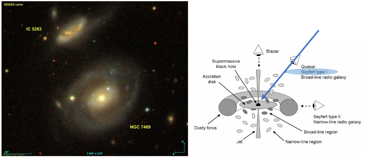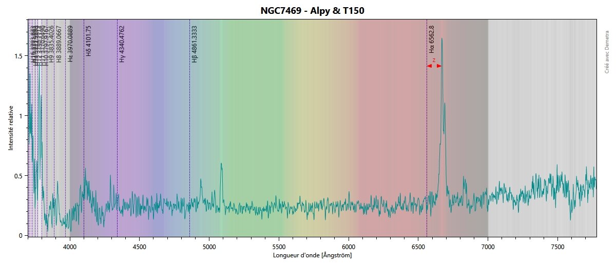 Bonjour-bonsoir tout le monde ! Suite de mes travaux pratiques avec l'Alpy 600 sur les redhifts, blueshift et calcul des distances. Ma première cible pour prendre en main le logiciel de Patrick Chevalley, CCDciel (de la famille de Carte du Ciel) sera M31. Ce logiciel gère trois caméras en même temps, celle du chercheur (lunette de 50/205 + ASI678M), celle de guidage (ASI290 Mini) et la caméra d'acquisition, une Player One à capteur IMX585M. Il est relié à Carte du Ciel pour le choix de la cible et à ASTAP pour l'astrométrie. Aperçu : 10 x 240" + DOF + réduction des données avec DEMETRA et voilà le spectre de M31 : On remarque un petit décalage à gauche (vers le bleu) des raies Ha et Hb de 4.9 à 6.35 A. Puis quelques formules simples à appliquer > https://media4.obspm.fr/public/ressources_lu/pages_galaxies/spectro.html et je trouve un blueshift moyen de -0.00099 pour -0.001 attendu. Ceci donne une vitesse de rapprochement de 301.67 km/s pour 300 km/s attendus. L'opérateur est content.. enfin jusqu'à cette étape C'est quand j'ai voulu calculer la distance qui nous sépare que ça s'est compliqué dans ma petite tête.. 13.29 M al pour 2.5 M al, il y a un os qui ne colle pas ! Chat GPT m'a expliqué que M31 fait partie de notre groupe local de galaxies, des galaxies qui se rapprochent sous l'effet de la gravité et la formule de Hubble ne s'applique qu'à l'expansion. J'arrête donc de chercher l'erreur et la distance qui nous sépare devra s'estimer d'une autre manière, par les Céphéides entre autres. Mon petit télescope ne pourra pas faire une courbe de luminosité d'une Céphéide nichée dans M31. Tant pis, mais il va falloir que j'essaye ça sur une Céphéide de la Voie Lactée. Je suis donc passé sur une galaxie qui a la décence de s'éloigner de nous, NGC 7469, une galaxie de Seyfert. La voilà vue depuis la caméra du chercheur.. je remercie chaleureusement l'astrométrie et CCD ciel. Même principe que pour M31 mais là ça colle, le spectre est bien décalée sur la droite vers le rouge, un redshift, on en mesure la valeur sur la raie Ha. J'obtiens un redshift moyen de 0.01546 pour 0.01588 attendu (2.6% d’erreur). La vitesse radiale corrigée de la vitesse héliocentrique (+17.5 km/s) est de 4618.74 km/s pour 4506 ± 26 km/s attendus et la distance qui nous sépare de NGC7469 est de 203.49 M al (217 M al attendus). L'opérateur est enfin content Une galaxie de Seyfert ressemble souvent à une galaxie spirale « normale » comme la Voie lactée, mais son noyau est extrêmement lumineux, parfois plus brillant que toutes les étoiles de la galaxie réunies. Ce noyau actif est appelé un AGN (Active Galactic Nucleus = Galaxie à Noyau Actif). Au centre de ces galaxies se trouve un trou noir supermassif qui avale de la matière et forme un disque d’accrétion en spirale autour de lui. Il existe deux classes principales de Seyfert selon la façon dont on observe le noyau (l'angle). Si vous souhaitez fouiller plus le sujet, je vous conseille le post de @GeoffreyJoe sur le Quasar 3C 273, un phare dans la nuit La conséquence spectroscopique est la largeur des raies qui se trouvent élargies par l'effet Doppler. On "voit" le disque d'accrétion tourner rapidement, c'est même visible depuis mon jardin ! NGC 7469 est une galaxie Seyfert de type I. Forcément, le prochain TP sera une Seyfert de type II et si possible un quasar.. Et voilà, c'est tout pour aujourd'hui !