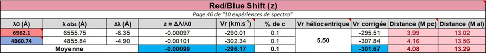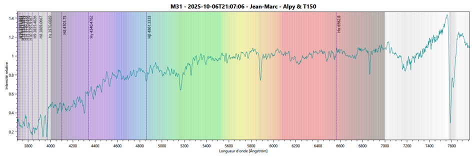 Bonjour à tous ! Je continue à faire mes devoirs de spectro avec ce coup-ci la mesure de vitesse de rotation de M33 après avoir un peu loupé la manip sur M82.. M33 ne rentre pas totalement sur mon image à l'Alpy 600, du moins quand il est monté sur mon C9 à 1480 mm de focale. L'idée est donc de capturer le spectre de deux nébuleuses HII, dans un bras d'abord puis dans le bras opposé. Forcément ça s'est pas bien passé.. je n'ai pu capturer qu'un seul spectre, celui de NGC604, la nébuleuse HII la plus importante de M33. La deuxième était trop faible pour que j'arrive à la voir et à la caler correctement sur la fente du spectro, le vent ne m'a pas aidé et finalement les nuages ont clôturé le truc ! Ca donne ça avec des émissions en Ha et en [OIII] et la raie aurorale issue de la haute atmosphère terrestre et ça, ça va être bien utile. Bien que le spectre ait été traité et calibré en longueur d'ondes avec amour, il me reste quand même un décalage (que je ne m'explique pas encore..). On le voit sur la valeur de la raie aurorale qui devrait être à la valeur théorique car pas de shift sur l'atmosphère terrestre, 5579.22 Å pour 5577.35 Å théorique = 1.87 Å de décalage Reste plus qu'à relever les valeurs des raies Ha et les deux [OIII] pour faire une moyenne du décalage Doppler en les ayant corrigées des 1.87 Å de décalage du spectre. J'ai amené la correction du déplacement de M33 par rapport à la Terre au moment de la capture du spectre (elle s'éloigne de nous à 8.2 km/s). Pour terminer, il faut prendre en compte l'inclinaison de M33 par rapport à la ligne de visée (55° et vitesse réelle = vitesse mesurée / Sinus 55). Un Excel plus loin pour faire les calculs et j'obtiens une vitesse de rotation (à l'emplacement de NGC604) de -98.03 km/s : baissez la tête, elle vient vers nous ! Le site Hyperleda indique une vitesse de rotation de 100.1 km/s +/- 1.7 (clic) Content le type Chat GPT : La raie aurorale à 5577,35 Å correspond à l’une des émissions les plus célèbres des aurores polaires : c’est la raie verte de l’oxygène atomique. 🔬 Origine physique : Elle provient de la transition interdite de l’oxygène atomique neutre [OI] d’où une durée de vie longue de l’état excité (~0,7 s) ce qui explique pourquoi elle n’apparaît qu’en haute atmosphère, principalement entre 100 et 150 km d’altitude. C’est cette raie qui donne la couleur verte caractéristique des aurores boréales/australes.